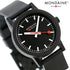 モンディーン エッセンス スイス製 メンズ レディース 腕時計 MS1.32120.RB MONDAINE essence アナログ ブラック 黒 ◆1951年、モンディーンは、「Frank & Bernheim」という時計の輸入販売を業務とする会社としてブラジルで設立され、1954年に社名をモンディーンに変更しました。1986年には、現クラシックコレクションとなる「スイス国鉄オフィシャル鉄道ウォッチ」を発表。その視認性の高さとシンプルで完成されたデザインは、誕生以来20年以上が経過した現在も世界中でロングセラーを記録しています。 モンディーンの特徴である、スイスメイド・アイコニック・シンプルを継承しながら、環境に配慮した再生可能原料をベースとして開発された『essence(エッセンス)』。ケースはクレオパトラも使用していたといわれるひまし油(キャスターオイル)をベースに、ストラップは再生可能原料をベースとしたTPU(熱可塑性ウレタン)素材でつくられ、クイックリリース機能がついてベルトの着脱が工具なしで簡単に交換可能です。着け心地も軽く、ミニマルなデザインとサイズ感が腕元をすっきり見せてくれます。モンディーンでは珍しいブラックのダイヤルは、コーディネートをよりシックに魅せてくれます。