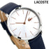 ラコステ 35mm クオーツ レディース 腕時計 2000986 LACOSTE アナログ シルバー×ネイビー 革ベルト ◆LACOSTE(ラコステ)は、1933年に設立された、フランスのアパレルブランドです。1933年にテニスプレイヤーのルネ・ラコステが、当時フランスで最大のニット製造会社のオーナー社長のアンドレ・ジリエと設立。創業者のルネ・ラコステはプロのテニス選手であり、1920年頃からポロ選手に使用されていた襟付きのニットシャツ、いわゆる ポロシャツをテニス業界に初めて持ち込んだ選手です。 シンプルなデザインと3時位置のブランドロゴのワニがポイント。シーンを問わずお使いいただけ、誕生日などのプレゼントやペアウォッチにもおすすめです。