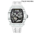 正規品 サーボンバ TB8208 エレメンタルシリーズ カーボンファイバー オープンハート メンズ 腕時計 TB8208CF-05 TSAR BOMBA TB8208 ELEMENTAL SERIES アナログ ブラック ホワイト 黒 ◆TSAR BOMBA(サーボンバ)は、その名の通り“圧倒的な存在感”を持つ2019年に誕生した香港発のウォッチブランドです。常識を超える原子力エネルギーにインスパイアされ、“時計も宇宙のようにダイナミックに変化をし続けるべきである”という理念を掲げています。肉厚でビッグサイズの大胆なウォッチケース、洗練された色使い、優れた耐久性、そして、時計製作における繊細な芸術が見事に融合しています。 「エレメンタルシリーズ」は、宇宙を構成する基本的な物質や元素をテーマにデザインされました。スケルトン化された文字盤は、内部の精巧な仕組みを美しく映し出し、繊細な歯車やブリッジ、テンプホイールがまるでアート作品のように視覚的な魅力を提供します。ベゼルにはカーボンファイバーを採用しています。 機械式腕時計