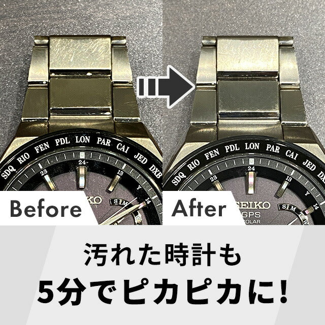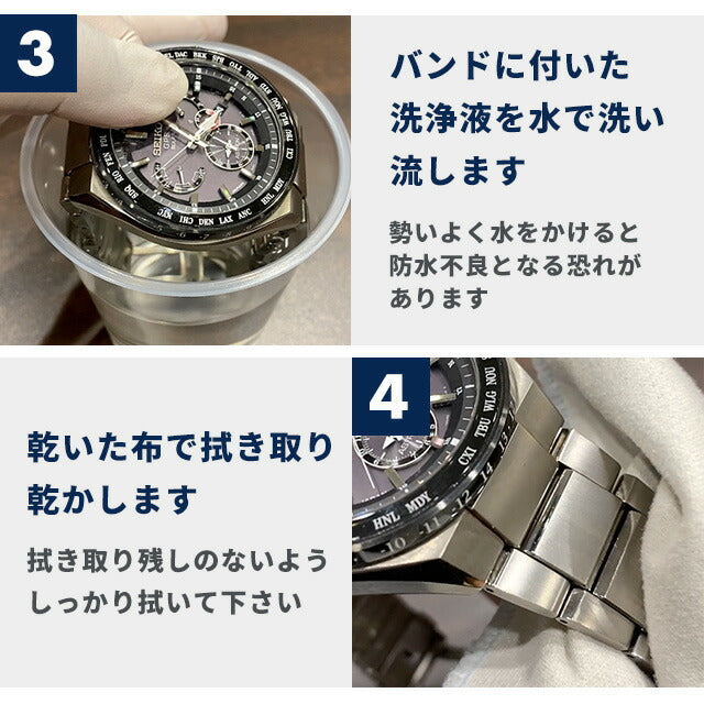 This is a product recommended for people like this. - Those who are concerned about dirt on the metal straps of a wristwatch - Those who want to try out the effects of watch band cleaning solutions This detergent effectively removes dirt on the metal straps and can clean the material without damaging it. The main ingredient is 56% surfactants (polyoxyethylene alkyl ethers, trialkyl amine oxide), and each bag contains 5g of detergent. When using, dissolve one bag of this product in 200ml of water before using. Liquidity is neutral and can turn into a mild alkaline condition if stored for a long period of time. Although it is compatible with stainless steel, titanium, urethane, and other metal materials, please note that it cannot be used with leather products. The expiration date of the product is listed on the back.