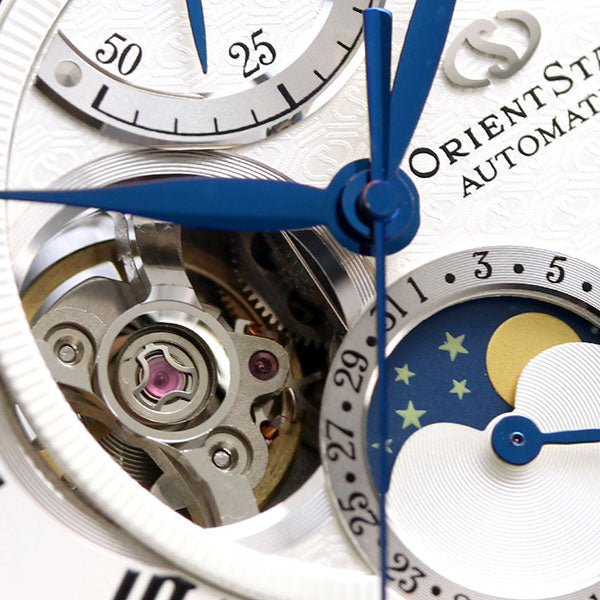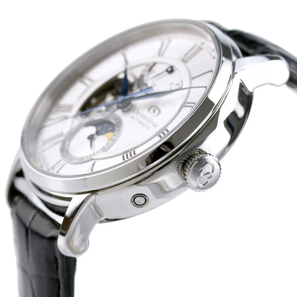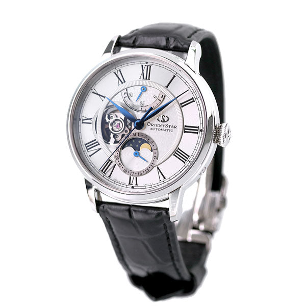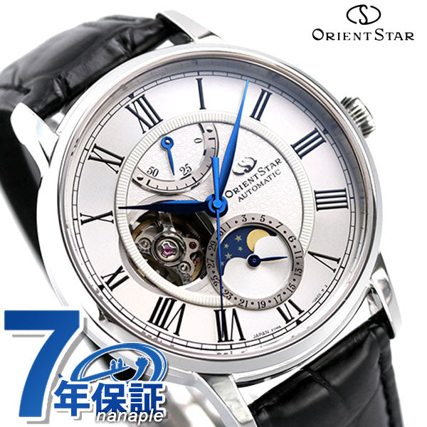 正規品 7年保証キャンペーン 送料無料 オリエントスター クラシック メカニカル ムーンフェイズ 月齢時計 オープンハート 日本製 自動巻き ペアウォッチ メンズ 腕時計 RK-AY0101S ORIENT STAR CLASSIC Mechanical Moon Phase アナログ シルバー×ブラック 革ベルト ◆パワーリザーブの持続時間が50時間以上に進化。更に、時針の長さや針重心のバランスを見直すことで、視認性や判読性も向上しました。長くご安心してお使い頂けるよう、デザイン性だけでなく使いやすさにもこだわって仕上げたモデルです。最大の特徴は6時位置のムーンフェイズ表示。夜空を表す深いブルーと星、そして優しい光を放つ月のモチーフをあしらった月齢車が29.5日周期で回転し、新月から満月までの月相を表します。文字板にはムーブメントが見えるセミスケルトン小窓とパワーリザーブインジケーターを搭載。機械式の醍醐味が存分に味わえる機能・デザインに仕上げました。 発売日:20年11月発売 機械式腕時計 Made in Japan