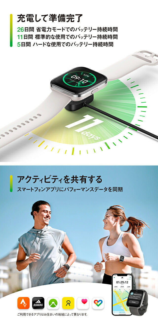 | 仕様 | 防水グレード IP68 ディスプレイ素材 TFT ディスプレイサイズ 1.91インチ 解像度 320×380 PPI 260 バンド仕様 クラシックピンバックル バッテリー容量 300 mAh(標準値) 充電方法 マグネット式充電 充電時間 約2時間 【スポーツ機能】 スポーツモード 120+ スマート認識 6つのスポーツ 高度なランニングサポート 仮想ペーサー、自動ラップ ワークアウトステータス PeakBeats? (Vo2Max、完全回復時間、トレーニングの負荷・効果など) インターバルトレーニング 有 外部デバイスへの接続 無 運動データのアナウンス 有 【ヘルス機能】 24時間モニタリング 心拍数/血中酸素レベル/ストレスレベル 手動測定 心拍数/血中酸素レベル/ストレスレベル/ワンタップ測定(3つの健康指標) 睡眠の質のモニタリング 睡眠段階(REMを含む) 昼寝の時間/睡眠時の呼吸の質/睡眠スコア 健康評価システム PAI 呼吸エクササイズ 有(1種類) 生理周期トラッキング 有 健康リマインダー 心拍数の異常/低血中酸素/高ストレスレベル/呼吸エクササイズ/座り過ぎのリマインダー 【センサー】 健康 BioTracker PPG 運動 3軸加速度センサー 接続 Bluetooth 5.2 BLE 測位システム 無 モーター ローターモーター 【その他】 ミニアプリ 対応※一部日本語非対応 スリープモード 有 オフライン音声アシスタント 無 Alexa(日本語対応) 有 ウォッチフェイス 100+ アプリ Zeppアプリ ※タブレット未対応 搭載OS Zepp OS 3.0以上 対応デバイス Android 7.0 以上、iOS 14.0 以上 |