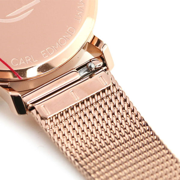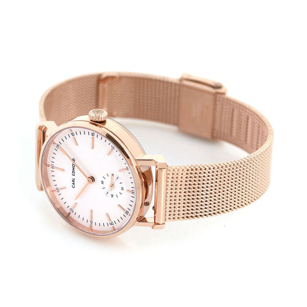 正規品 カール エドモンド リョーリット 32mm スモールセコンド 小秒針 クオーツ ペアウォッチ レディース 腕時計 CER3211-MR16 CARL EDMOND RYOLIT アナログ ラウンド ホワイト×ピンクゴールド ◆CARL EDMOND(カール・エドモンド)は、スイスのクリエイティビティと北欧のミニマリズムが美しく融合した、スウェーデンのウォッチブランドです。ブランド名は、スウェーデンで一般的な名前のひとつ「カール」と、古期フランス語で幸せや喜び、裕福などを意味する「エドモンド」を掛け合わせたもの。スイス人の著名ウォッチデザイナーのエリック・ジローとエイドリアン・グレッシングが手掛けた、男女問わずさまざまなシーンに対応するミニマルデザインが特徴です。 ラウンド型が特徴のRyolitシリーズ。上部にシグネチャープレートが付いたアシンメトリーの形状もポイントです。また、ベルト裏面のつまみのついたバネ棒をスライドさせるだけの操作でバンドの取り外し、取り付けが簡単に行えます。ペアウォッチとしてはもちろん、プレゼントにもおすすめです。