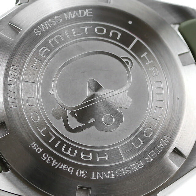 3年保証キャンペーン ハミルトン カーキ ネイビー オープンウォーター オート 41mm スイス製 メンズ 腕時計 H77455331 HAMILTON KHAKI NAVY OPENWATER AUTO アナログ ブラック モスグリーン 黒 ◆HAMILTON(ハミルトン)はアメリカ発祥の老舗ブランドです。創業翌年に誕生した懐中時計「ブロードウェイ・リミテッド」は、他の時計よりも正確に時を刻むことから鉄道用時計として採用されました。その後も航空用時計や軍用時計として採用されるなど、品質の高さと流行にながされない独自のデザインが世界中の人々に支持されています。 高い技術性能とアイコニックな外観が特徴の「カーキ ネイビー オープンウォーター オート」。「フロッグマン」と呼ばれたオリジナルデザインと同様、41mmのステンレススチール製ケースは堅牢なブリッジ型のリューズガードがねじ込み式リューズを保護し、30気圧(300m)の防水性能を確保しています。ブラックダイヤルにはスーパールミノバ加工が施され、どんな状況でも時刻を正確に読みとることができます。この41mmの「カーキ ネイビー オープンウォーター オート」には、波打つ海面をイメージしたウェーブ状のグリーンラバーストラップが付属します。機能性と装着性を兼ね備えた、水陸のヒーローとなるタイムピースです。 機械式腕時計