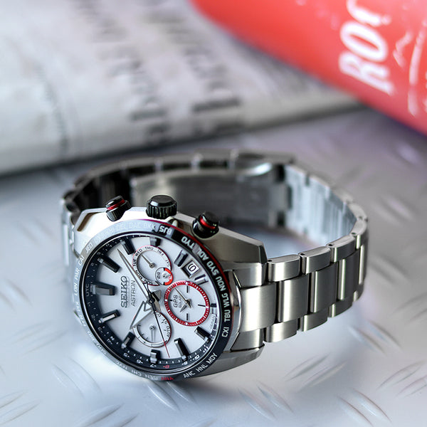 ベゼルは側面にスカーレットラインをあしらったセラミック製。