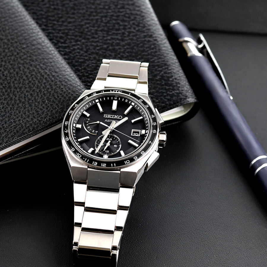 ケース一体型のチタンブレスレットがケースの存在感を引き立てると共に、軽やかで洗練された印象に。