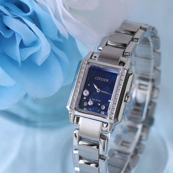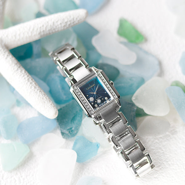 スクケア形ケースの両サイドは、「地球が輝き続ける未来」へと続くまっすぐな道を象徴。 そこに20石のダイヤモンドを一列にセッティングしています。 丁寧に磨きあげた4個のパーツが美しいラインと立体感を生み、ジュエリーのような輝きを放ちます。 サファイアガラスに浮かぶ大小2石のダイヤモンド、文字盤上の2石のダイヤモンドを絶妙なバランスで配置し、奥行きを感じるデザインに仕上げました。 合計0.1カラットのダイヤモンドが輝き、華やかな腕元を演出。 華やかにドレスアップしたスタイルはもちろん、日常のカジュアルなスタイルにも合わせやすいです。【数量限定1200個】 商品番号:EG7060-93W ななぷれ価格 93,500円(税込) ▼コチラからご購入いただけます▼