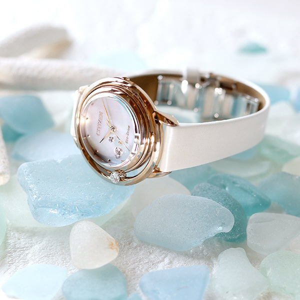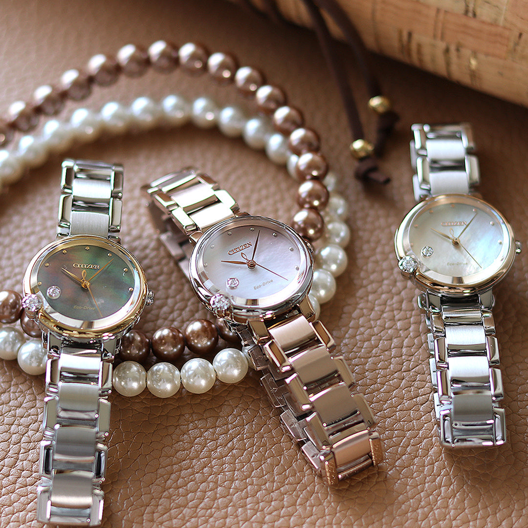 スズランを思わせる柔らかな曲線のフォルムと白蝶貝の文字板でみずみずしく、清楚で凛とした上品さを演出します。 8時の位置で輝く1ポイントのダイヤモンドは雨あがりのスズランに輝く花雫を表現。 ケースは厚みを感じさせず、腕に馴染みやすいすっきりとしたデザインを採用。 香水瓶をイメージして3時の位置にあしらった4ポイントのダイヤモンドとりゅうずを彩るブルーのアクセントが、腕元を見るたびに、可憐なスズランの花を手にした時の幸せな気持ちを呼び起こしてくれるモデルです。 地球のように美しいサステナブルウオッチ、CITIZENL(シチズンエル)。 商品番号:EM1060-87N・EM1063-89D 発売日:23年4月 ななぷれ価格 (EM1060-87N) 48,400円(税込) EM1060-87Nは ▼コチラからご購入いただけます▼