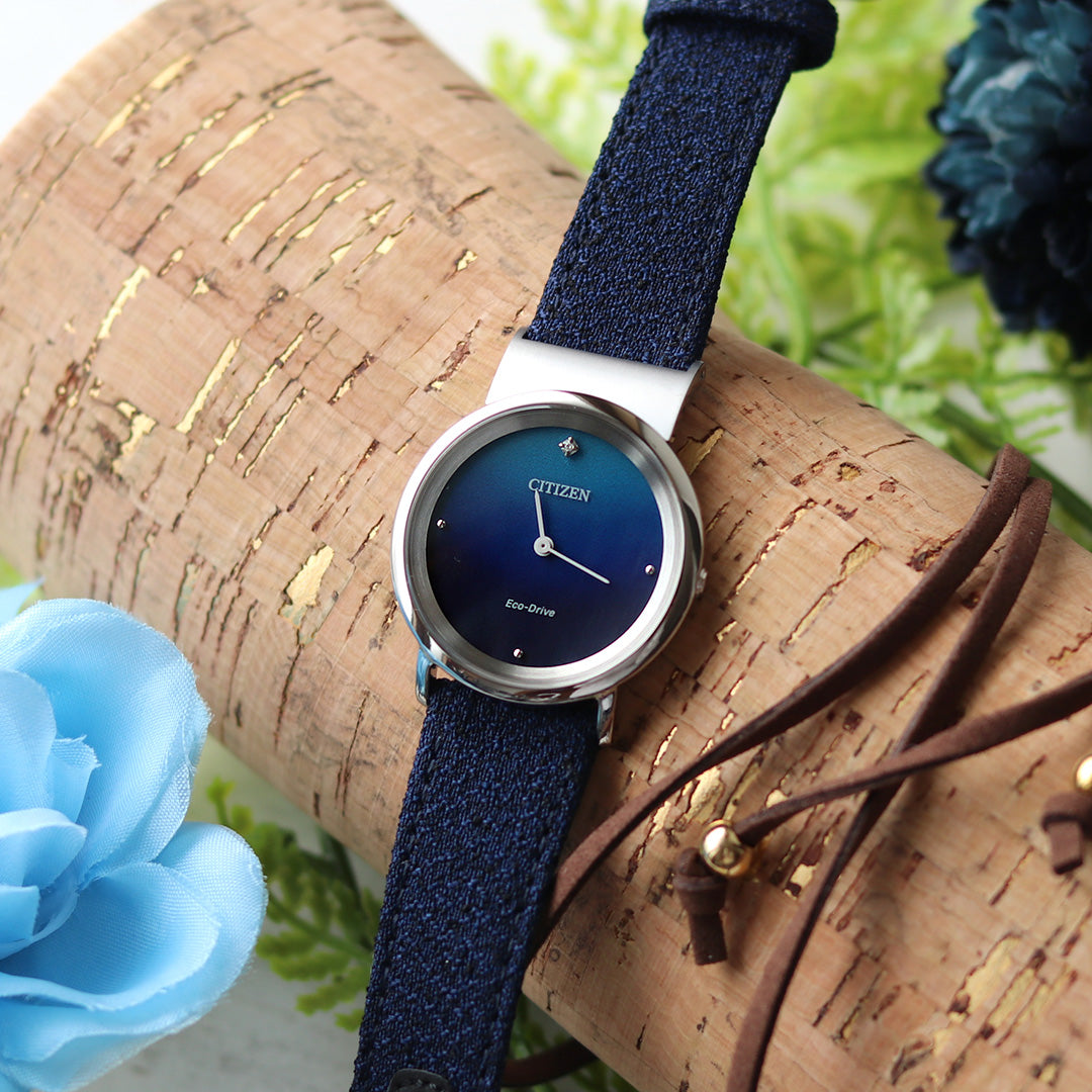 ストライプとラメで、光の揺らぎを表現した深みのある文字盤。 大胆なカットを施したカーブサファイアガラスと、やや丸みをおびたケースラインが女性のしなやかさと芯の強さを感じさせます。 文字盤は「光の揺らぎ」をテーマにデザイン。 ストライプのパターンとラメの煌めきが、深みのある美しさを演出しています。 メッシュバンドに加え、サステナブルな素材「ECOPET」を使用した替えバンド付き。 レバー付きばね棒仕様なので、その日の気分やファッションに合わせて自分で手軽にバンドの付替ができます。 地球のように美しいサステナブルウオッチ、CITIZEN L(シチズン エル)。 商品番号:EW5590-62A・EW5593-64D・EW5597-63L ななぷれ価格(EW5590-62A)35,200円(税込) EW5590-62Aは ▼コチラからご購入いただけます▼ E