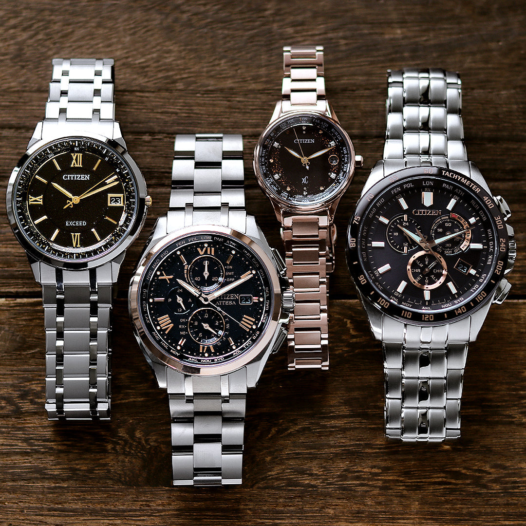4モデルに共通する黒と金のカラーリングは、シチズンが30年間挑戦をし続けた、電波時計の新たなる一歩の始まりの「夜明け」を表現しています。 確かな品質と洗練されたデザイン。 30年進化し続けてきた電波時計の一つの到達点は「薄さ」。 チタニウム製ウオッチ世界最薄レベルを実現したエクシードの電波時計をベースにした特別仕様です。 見返しリングには、粘着層の上から金粉を蒔いて定着させる蒔絵手法を採用しています。 文字板にラメをあしらい、新たな夜明けを祝福するきらびやかなイメージを文字板全体で演出しました。 大人のためのドレスウオッチ、シチズン EXCEED(エクシード)。 商品番号:AS7156-62E・AT8254-61E・EC1166-74E・CB5876-60E 発売日:23年1月 ななぷれ価格 (AS7156-62E) 111,650円(税込) ▼コチラからご購入いただけます▼