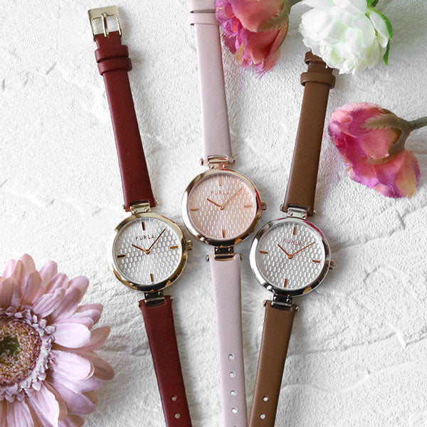 文字盤にはアイコニックなFURLAのアーチロゴを配置。 文字盤のギョーシェが光の陰影を強調し、エレガントな存在感を演出します。 年代問わずお使いいただけ、誕生日や記念日などのプレゼントにもおすすめです。 FURLA(フルラ)は、1927年にイタリア・ボローニャでアルド・フルラネットにより創立されました。 カラフル、ジョイフル、コンテンポラリーなイタリアのライフスタイルを、バッグやアクセサリーなどのアイテムへ投影させています。 伝統的なクラフトマンシップ、熟練したアルチザンの持つ専門知識、そして革新的なデザインを礎に、2017年に創業90周年を迎えました。 素晴らしい品質基準は、今や世界中から定評を得ています。 商品番号:WW00005005L3・WW00005003L1・WW00005008l3WW00005001L1・WW00005009L2・WW00005010L3・WW00005011l1 ななぷれ価格(WW00005005L3)23,100円(税込) WW00005005L3は ▼コチラからご購入いただけます▼
