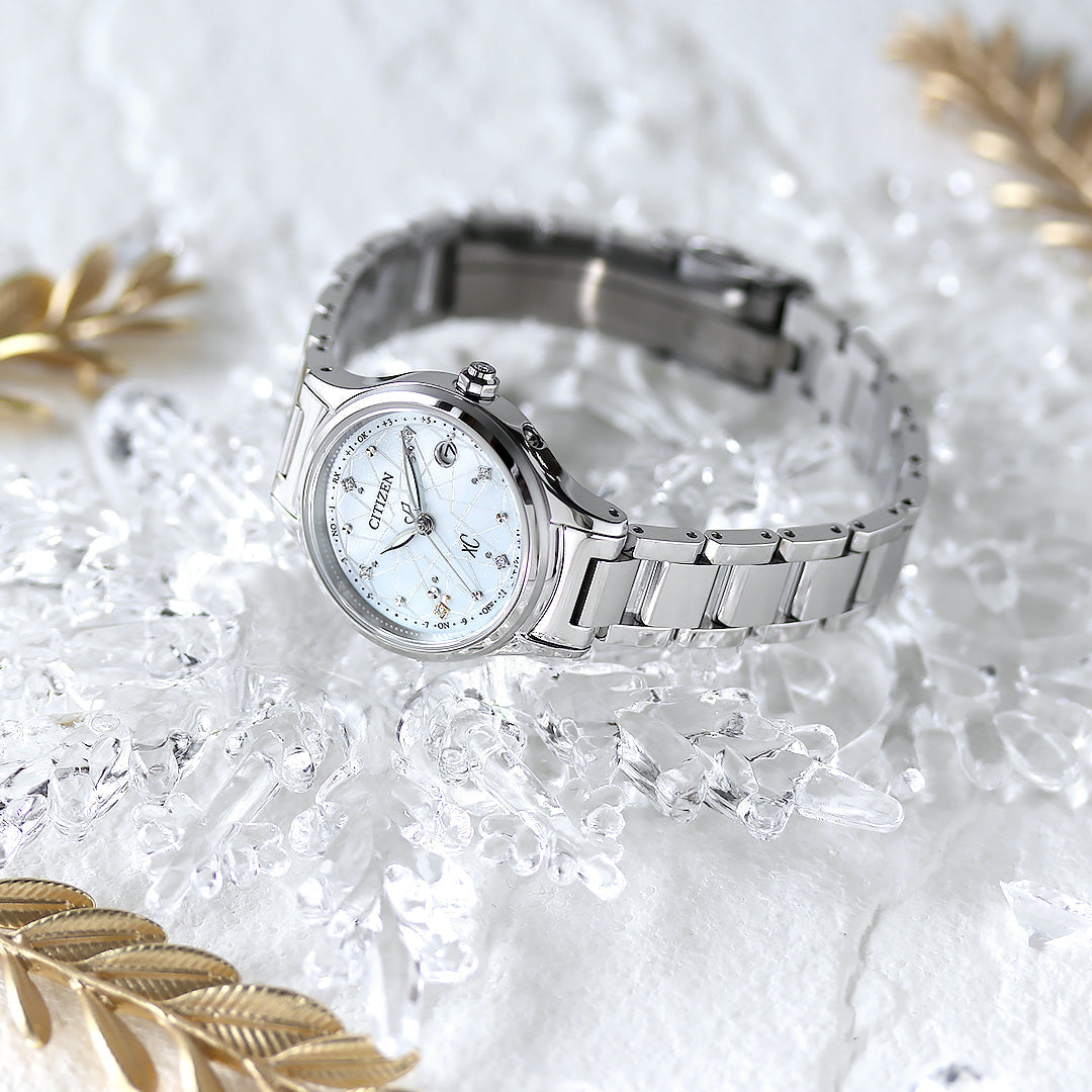 爽やかなシルバーが印象的な、hikari コレクションの限定モデルです。 美しい白蝶貝の文字板に、エッチングパターンとパールプリントで夏の太陽の輝きを描いています。 インデックスにはラボグロウンダイヤモンドとカットパーツをあしらい、光に反射する波のきらめきを表現しました。 さらに、8時位置には日差しがキラキラ反射する様子をゴールドで表すなど、細部にまでこだわっています。 りゅうずにも、アクセントとしてラボグロウンダイヤモンドをセッティング。 特別感のある上品で華やかなデザインが魅力です。 前を向く女性を応援するエンパワーウオッチブランド、シチズン xC(クロスシー)。 商品番号:ES9490-87D ▼コチラからご購入いただけます▼
