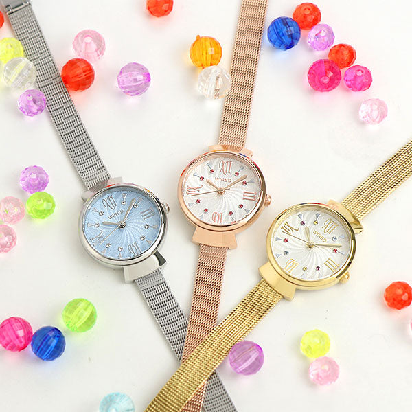 キャンディを連想させるようなケースデザインと、渦巻き型打ちダイヤルが特徴のモデル。 文字盤には8ケ所スワロフスキーを配置。 華奢な細めのメッシュバンドもポイントです。 年代問わずお使いいただける、上品さと可愛さを兼ね備えた腕時計です。 プレゼントにもおすすめです。 誕生日・記念日・就職祝いなど、大切な方へのプレゼントにも人気! 商品番号:AGEK458・AGEK457・AGEK459 発売日:20年2月8日 ななぷれ価格 (AGEK458)11,818+税 |