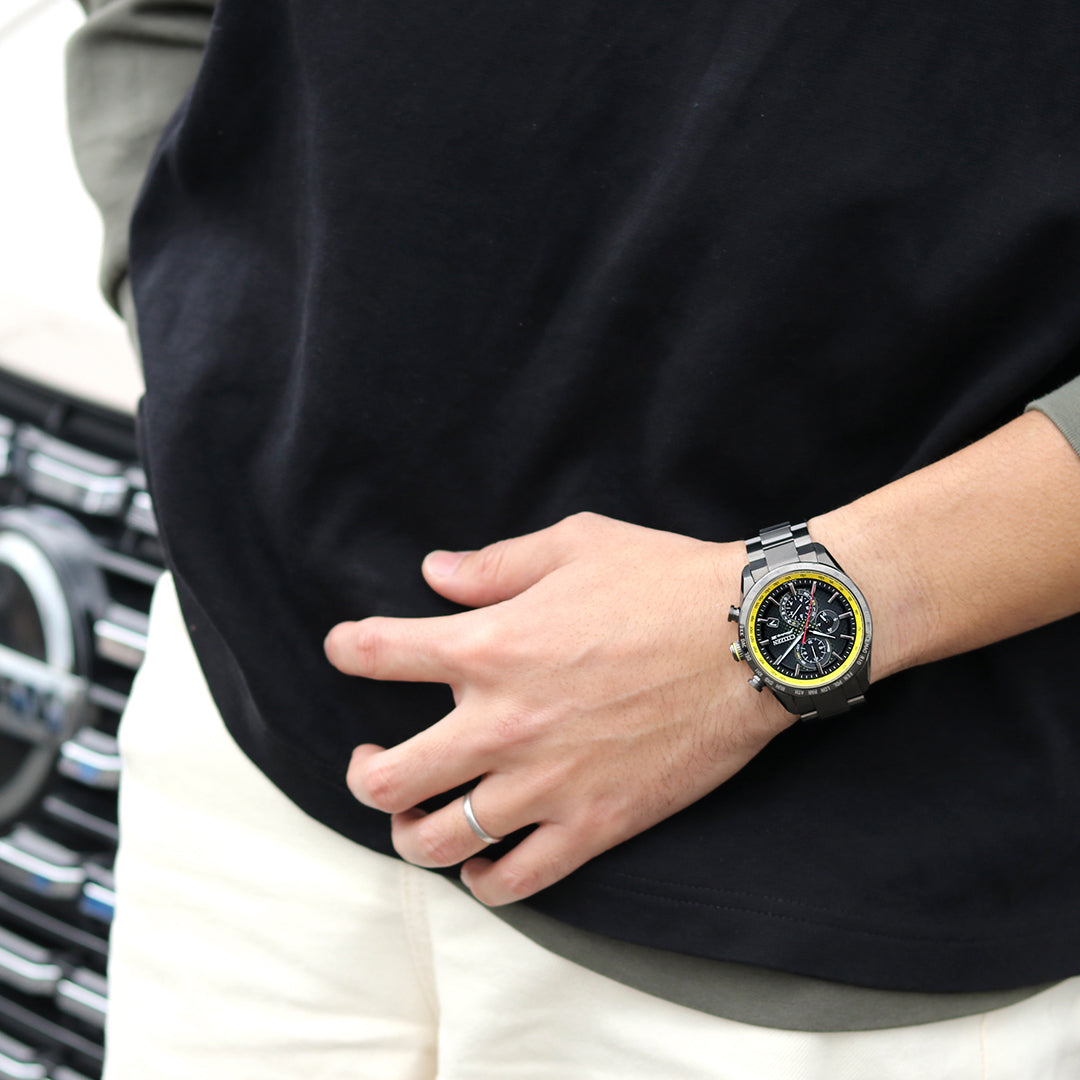 ブランド誕生35周年目を迎えるアテッサが、日産フェアレディZとコラボレーション 新型フェアレディZのボディカラーの中でも特別な「イカズチイエロー」をベースにした、こだわりのデザインです。 秒針は車のエンジン許容回転数を表すレッドゾーンからインスピレーションを受けたレッドを差し色として全体の印象を引き締めています。 また、りゅうずにはフェアレディZの「Z」、裏ぶたにはNISSANのロゴが入ります。 商品番号:AT8185-89E・AT8185-97E ななぷれ価格 132,000円(税込) |