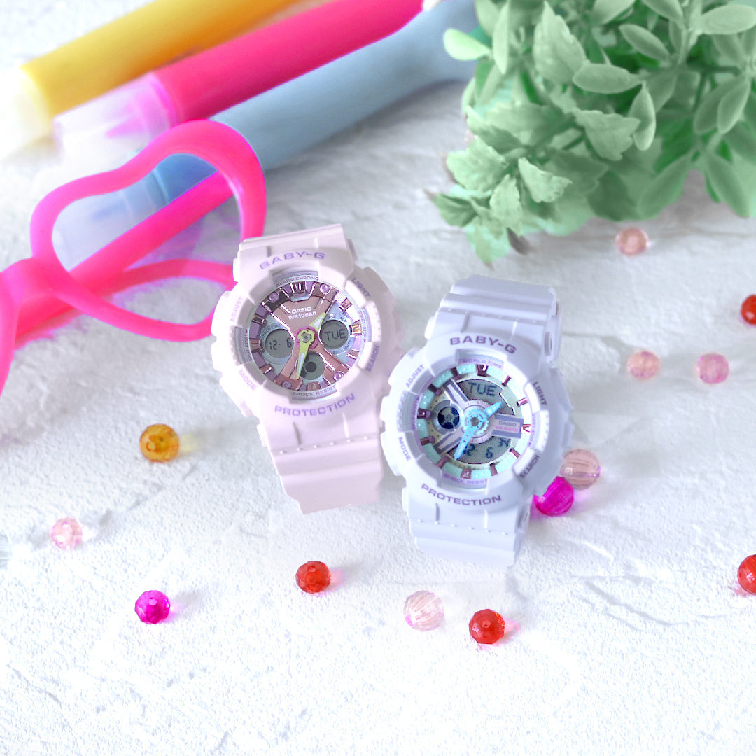 パステル調のカラーブロックとグラデーションが女性らしいポップさを演出し、多彩で柔らかな色合いが魅力的なデザインに仕上がっています。 針やインデックスなどの文字板にはメタリック仕上げを施し、マットなケースやバンドとの組み合わせで、絶妙な輝きを放っています。 また、耐衝撃構造、100m防水など、日常生活で活躍する機能性も備えています。 アウトドアシーンやカジュアルスタイルにおすすめです。 プレゼントにもおすすめです。 商品番号:BA-110XPM-6ADR・BA-130PM-4ADR ななぷれ価格 (BA-110XPM-6ADR) 13,980円(税込) |
