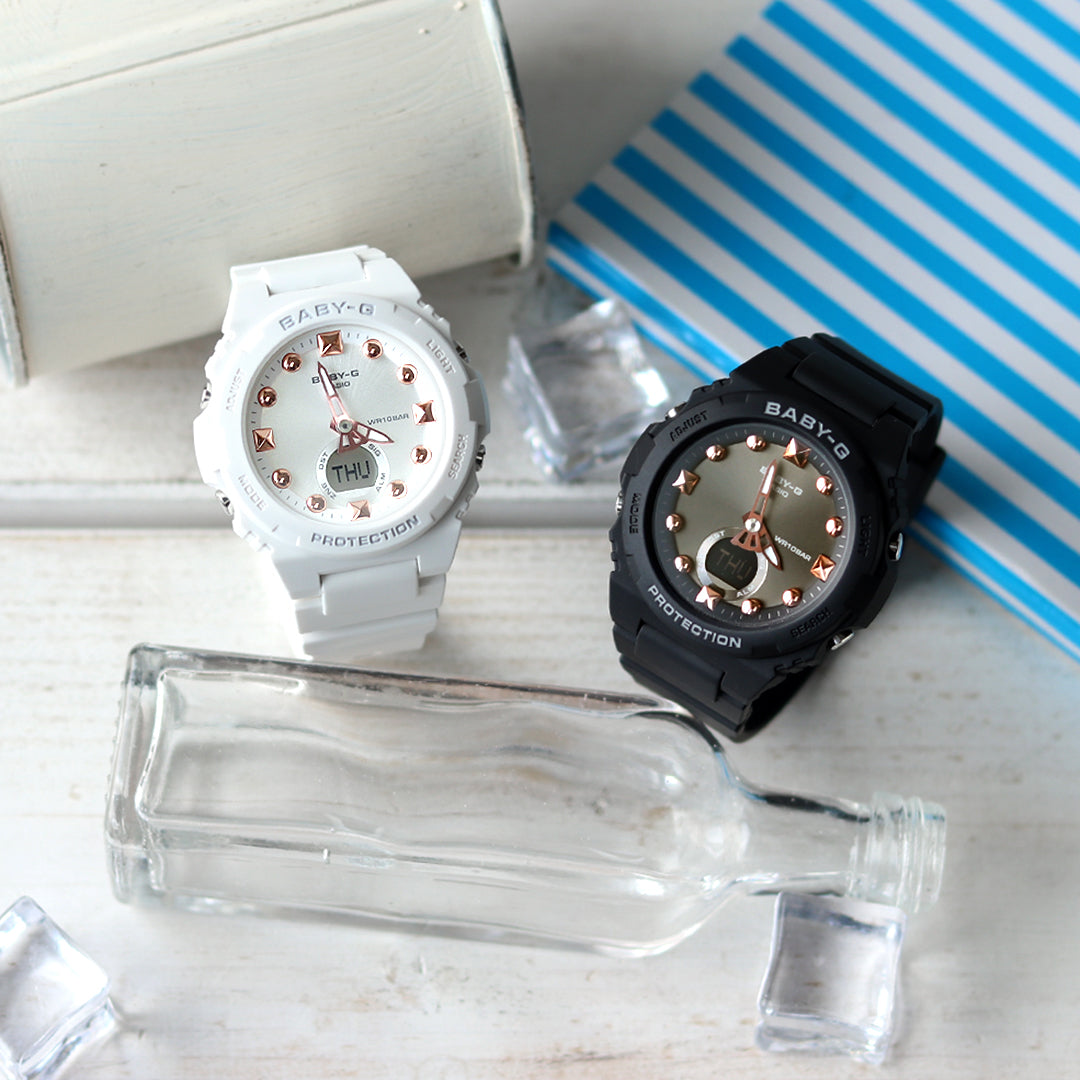 ベースモデルはスリムなケースと立体的なメタリックインデックスが特徴のBGA-320。 インデックスは蒸着仕様で、キラキラと輝く真珠や貝のような海の宝石をイメージしたメタリック調に仕上げています。 分針は人魚の尾ひれをモチーフにしたデザインを施しました。 着けると気分が上がる、遊び心のあるカラーとデザインです。 機能面では、耐衝撃構造や着けたままで水泳もできる防水機能など頼れる機能を搭載しています。 アウトドアシーンやカジュアルスタイルにおすすめです。 (国内モデル品番:BGA-320-1AJF9) アクティブな女性のためのカジュアルウオッチBABY-G。 商品番号:BGA-320-1ADR・BGA-320-7A2DR ななぷれ価格 14,300円(税込) |