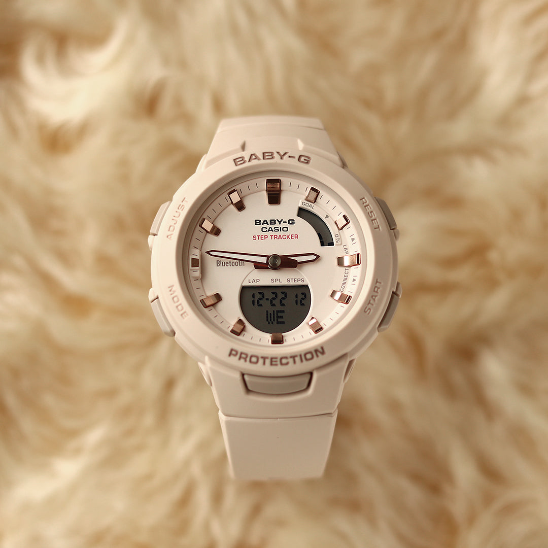 アスレジャーウェアと相性の良い、マットな質感で女性らしいカラーリングをラインアップ。 運動時の妨げにならないようケースも薄型化。 暗所でのワークアウトにも役立つオートダブルLEDライトも搭載し実用性を備えます。 3軸加速度センサーによる歩数計測機能、最大5本×20セットの計測が可能なタイマー、一定時間の間に歩数が少ないとお知らせするステップリマインダー機能など、日常の健康管理やスポーツ時に役立つ機能を搭載。 また、BABY-G初となる、スマートフォンリンク機能が搭載され、Bluetooth通信による専用アプリケーションとの連携で、日々の活動記録管理や運動設定がスマートフォン側からの簡単操作で実現しました。(国内モデル品番:BSA-B100-4A1JF) 商品番号:BSA-B100-4A1DR ななぷれ価格 11,680円(税込) |
