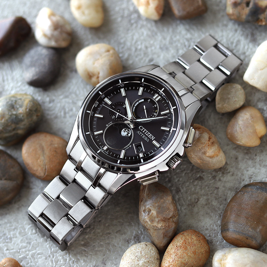 根強い人気を誇るAT8040シリーズのケース形状をベースに、新キャリバーを搭載したムーンフェイズウオッチ。 電波を使った月齢自動計算機能「ルナプログラム」を搭載。 受信した時刻情報から、ムーブ内部の独自の計算式を使ってその時点での月齢を計算し、6時位置にその様相を表現します。 ケースのエッジ感をベースモデルよりも強調し、足部分もより美しくのびやかなデザインに。 スポーティさを残しつつもエレガントな印象をひときわ高めています。 ムーンフェイズ部分には、印刷と金属電着を生かした技術を使い、星空の中で美しく輝くシルバームーンを表現。 隠れたもう一つの月の動きも楽しめるよう、円盤針に重なる上面の文字板をあえてグラデーション状に透けさせています。 見返しリングの都市名表示をなくし、すっきりとした見た目に。 チタニウムで次世代を進み続ける、シチズン ATTESA(アテッサ)。 商品番号:BY1001-66E ななぷれ価格 96,250円(税込) 発売日:23年7月 |