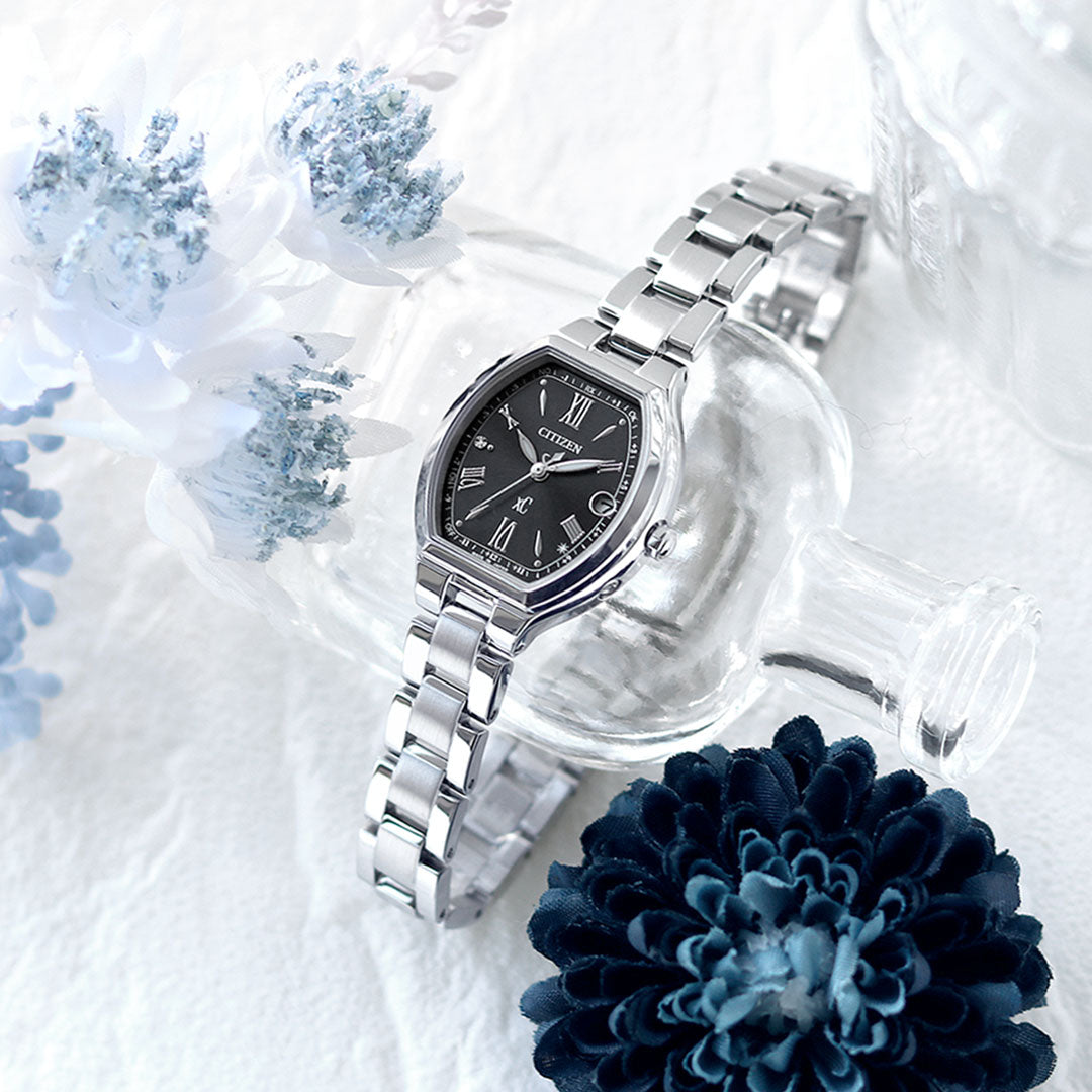 やわらかなフォルムのケースと文字板の美しい艶が手もとを上品に彩ります。 シルバー×ブラックのシンプルで洗練されたカラーリング。 存在感のあるやわらかなデザインのトノー型ケースが手もとを引き締めつつ、上品な優しさを感じさせます。 文字板は艶のある美しいブラック。 エレガントなデザインの飛びローマ数字インデックスが抜け感を演出しています。 4時と5時の間のTOKYO位置には、ワンポイントとして、きらめく光のマークをデザインしています。 前を向く女性を応援するエンパワーウオッチブランド、シチズンxC(クロスシー) 商品番号:ES9360-66E 発売日:24年2月 |
