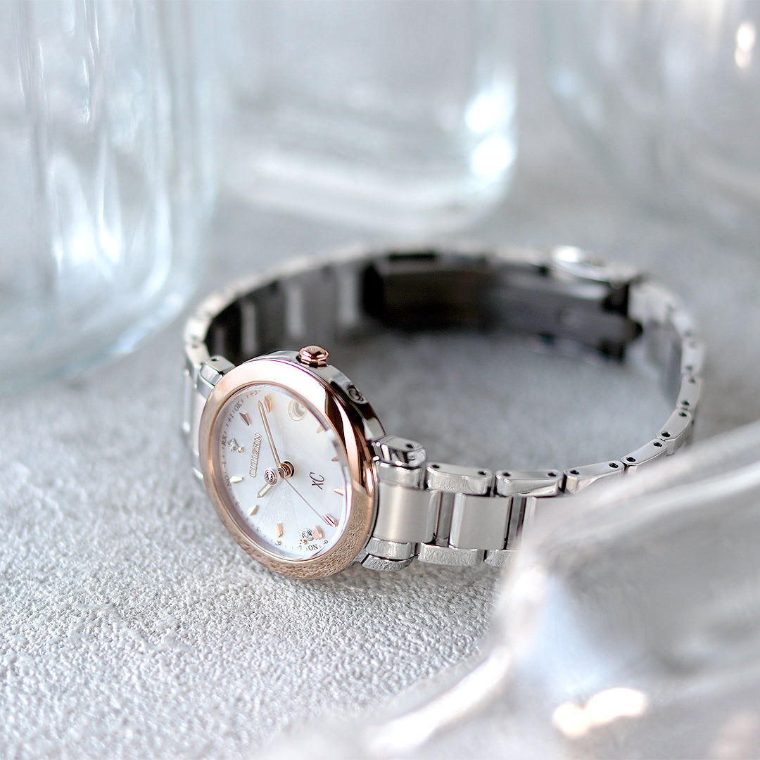 ・ガラスの中心で凛と咲く一粒のダイヤモンド。 どんな時も、この小さな花(フローレット)が自信となり、自分らしく輝き続けられるよう願いを込めた、hikari collectionの「フローレットダイヤモデル」。 白蝶貝文字板、上品なサクラ色のベゼル、8時位置に桜の花びらをモチーフにしたアクセントが華やかな印象を演出します。 文字板12時と8時の位置にダイヤモンドをセッティング。 放射パターンのエッチングとラメで、文字板上に光が広がるイメージを繊細に表現。 美しく華やかなデザインを際立たせます。 前を向く女性を応援するエンパワーウオッチブランド、シチズンxC(クロスシー)。 クロスシーは北川景子さんがイメージキャラクターのブランドです✨ 商品番号:ES9445-73W ななぷれ価格 96,800円(税込) |