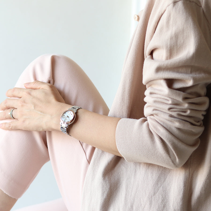 ・ガラスの中心で凛と咲く一粒のダイヤモンド。 どんな時も、この小さな花(フローレット)が自信となり、自分らしく輝き続けられるよう願いを込めた、hikari collectionの「フローレットダイヤモデル」。 白蝶貝文字板、上品なサクラ色のベゼル、8時位置に桜の花びらをモチーフにしたアクセントが華やかな印象を演出します。 文字板12時と8時の位置にダイヤモンドをセッティング。 放射パターンのエッチングとラメで、文字板上に光が広がるイメージを繊細に表現。 美しく華やかなデザインを際立たせます。 前を向く女性を応援するエンパワーウオッチブランド、シチズンxC(クロスシー)。 クロスシーは北川景子さんがイメージキャラクターのブランドです✨ 商品番号:ES9445-73W ななぷれ価格 96,800円(税込) |