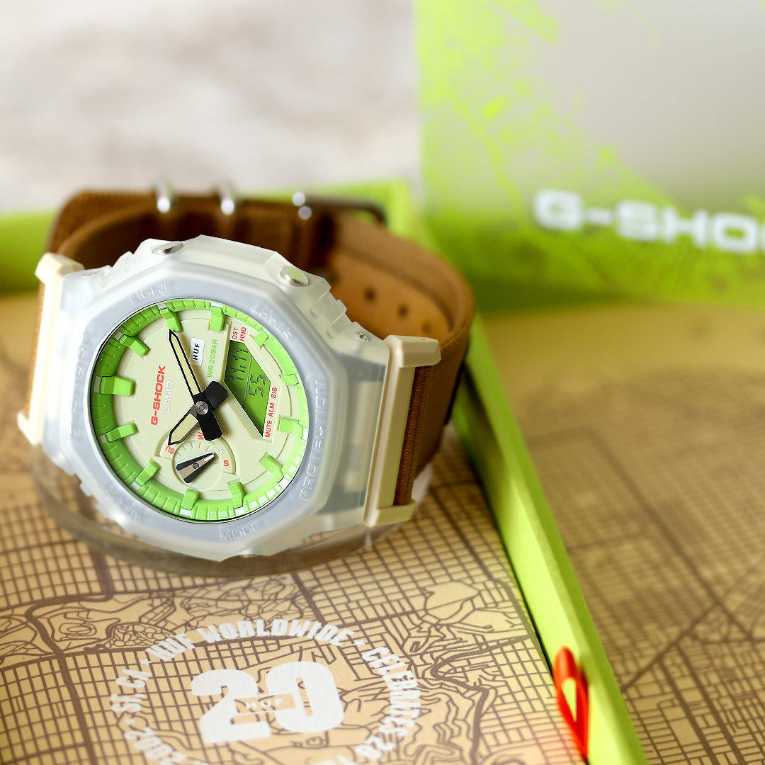 ベースモデルには人気のオクタゴンベゼルのGA-2100を採用。 スニーカーカルチャーからインスピレーションを受け、樹脂ケースとクロスバンド、メタルパーツといった異素材を組み合わせて、HUFならではのオリジナリティ溢れるデザインに仕上げ、HUFの世界観をプロダクト全体で表現しました。 文字板にはHUFの特徴的なカラーである、ライムグリーンとオレンジを配色。 裏蓋に刻印されたHUF20周年ロゴや、サンフランシスコの街並みを表現したパッケージと合わせ、細部にまでこだわった作りとなっています。 商品番号:GA-2100HUF-5ADR 発売日:11月 ななぷれ価格 17,980円(税込) |