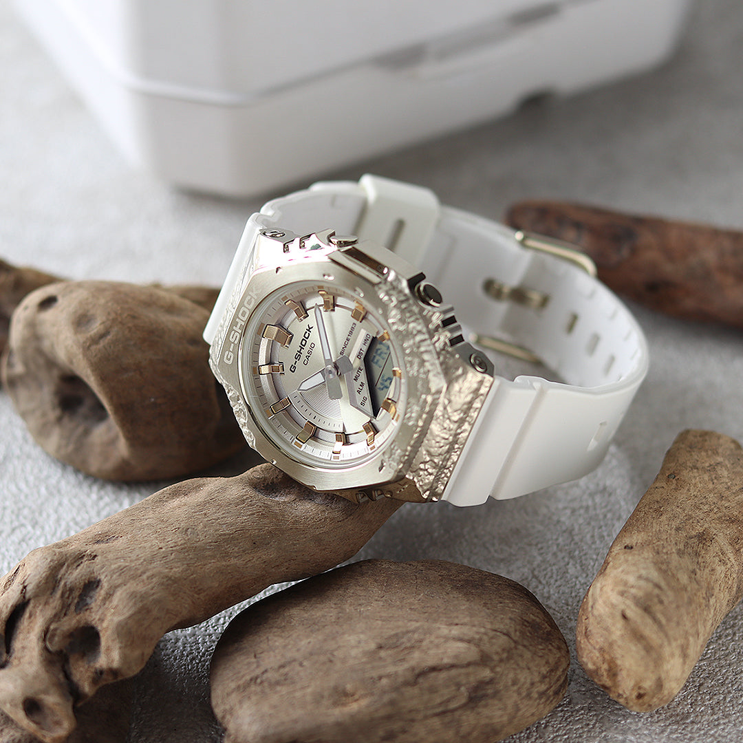 冒険者の道しるべとなった鉱石をコンセプトに、メタルベゼルには、鍛造とIP塗装、更にマスキング技術によりその輝きを表現しています。 文字板には、40周年を記念して“SINCE 1983”を配し、ケースバックにはG-SHOCK 25th、30th、35thのロゴもデザインを手がけたエリック・ヘイズの手による40thロゴを、遊環には“40”を表現するスターマークを刻印するなど、限定モデルに相応しい仕様になっています。 (国内モデル品番:GM-S2140GEM-9AJR) 商品番号:GM-S2140GEM-9ADR ななぷれ価格 25,920円(税込) |