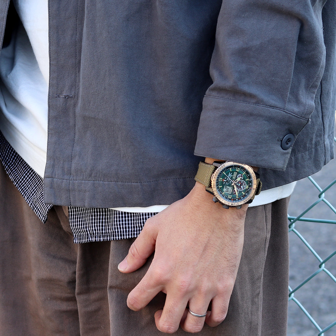 テーマは「The Moment of Adventure」。 「何気ない日常や郊外の自然環境、アクティビティーにも挑戦や、冒険を思わせる“瞬間”は存在する。 その冒険の“瞬間”を感じるとき、いつも自分の腕にはプロマスターがいる」街へ出よう。 プロマスターと共に。という意味がこめられています。 マットに仕上げたケースとベゼルを採用。 渋さの際立つストリートテイストに仕上げています。 バンドはナイロンを使用した両面貼り合わせ仕上げ。 表側の素材は、防弾チョッキなどにも採用されている高機能ナイロンです。 機能性、耐久性、安全性を兼ね備えた本格スポーツウオッチ、シチズン PROMASTER(プロマスター)。 商品番号:JY8074-11X ななぷれ価格 53,900円(税込) |