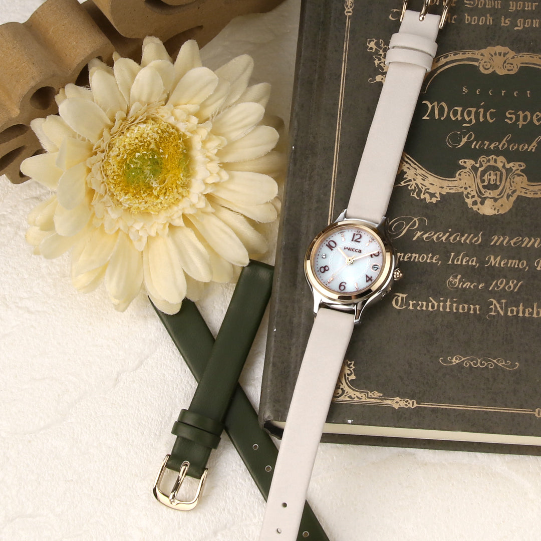 ケース径25.5mmでシンプルな形状の新型ケースを採用。 レトロな印象を感じられるアラビア数字フォントをダークカラーで仕上げ、視認性を高めるとともにクラシカルな表情を強調しました。 揺れるアクセサリーのようなティアドロップ形のパーツを1、5、7、11時の位置にセッティング。 文字板の中央には、クラシカルなチェーンバッグをモチーフにしたパターンを描いています。 ベーシックなアイボリーの「ECOPET」バンドを合わせた限定モデルには、大人っぽいカーキの替えバンドが付いています。 ウィッカは旬のカワイイがいっぱい詰まった腕時計ブランドです。 幅広い年齢層の方に支持されており、就活やビジネスシーンなどにも人気です。 商品番号:KS1-937-11 発売日:23年10月 ななぷれ価格 28,490円(税込) |