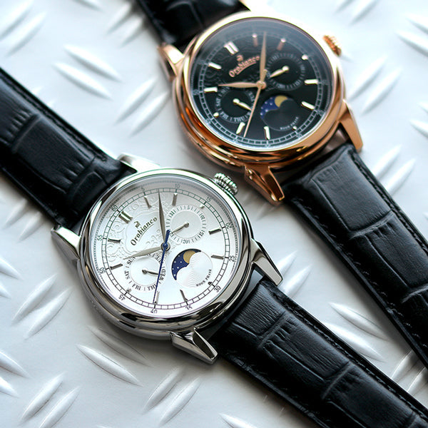 月の満ち欠け、満月を「白(明かり)」、新月を「黒(暗がり)」で表現したシリーズ、「BIANCONERO(ビアンコネーロ)」。 植字加工したインデックスとレールダイヤルが文字盤に深みをもたせ、球面ガラスで覆うことで、アンティークな雰囲気を一気に仕立て上げています。 また、ベルト裏面のつまみのついたバネ棒をスライドさせるだけの操作でバンドの取り外し、取り付けが簡単に行えます。 カジュアルスタイルからスーツやコートなど、どのコーディネートにも合わせやすく、オン・オフ問わずお使いいただけます。 プレゼントにもおすすめです。 オロビアンコ(Orobianco)は、1996年、ジャコモ・ヴァレンティーニとエリサ・ロヴァティによって設立された新進ファクトリーブランドです。 商品番号:OR0074-3・OR0074-33 ななぷれ価格 28,000円+税 |