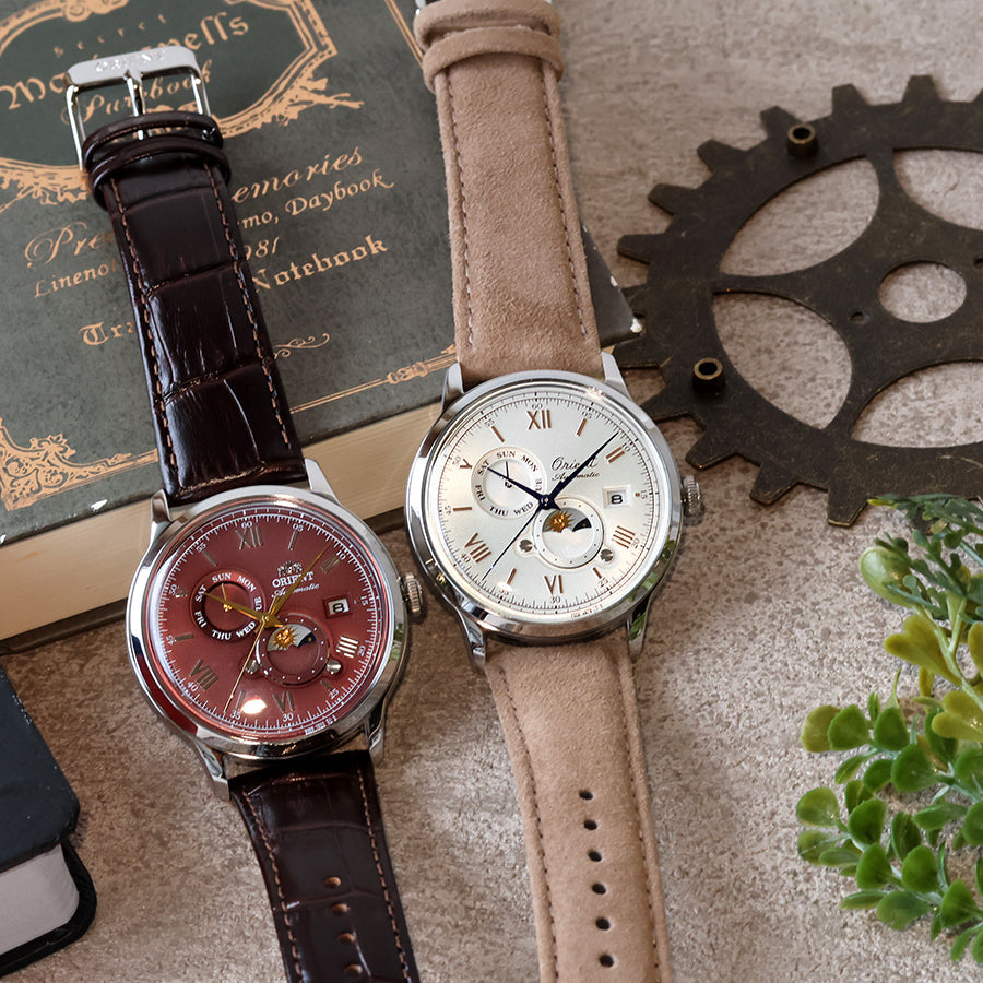 文字盤には1950年代に使用していた筆記体のオリエントロゴ、裏蓋には75周年アニバーサリーマークを刻印。 バンドはレトロ感を感じさせるベージュ色のヌバック皮革を採用しました。 イージーエクスチェンジストラップのため、気分や服装に合わせて簡単に付け替えることができます。 75周年専用のBOXが付属し、記念モデルにふさわしい特別仕様となっています。 上品かつ高級感のあるデザインで、スーツスタイルから、休日の大人カジュアルまで幅広く合わせることができます。[機械式腕時計] 商品番号:RN-AK0808S・RN-AK0807R 発売日:25年3月 |