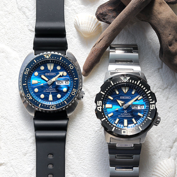 ダイバーにとってのウミガメ(TURTLE)は幸運の象徴。 ウミガメのように多くのダイバーに愛されているダイバーズウォッチです。 ワシントン条約で保護種に指定されているホオジロザメをモチーフにし、獰猛なサメを彷彿とさせる攻撃的でダイナミックな波を模したパターンとサメの象徴でもある隠し背びれを組み合わせダイヤルに施しました 。 また、止まれないサメを表現した尾びれの形状をした秒針を採用。 パートナーであるFabien Cousteau(海洋探検家/海洋保護への参)とタイアップ。 ダイバーズウォッチとしての高機能を備えつつ、タウンユースとしてもお使い頂けるスタイリッシュな時計です。 誕生日・記念日・就職祝いなど、大切な方へのプレゼントにも人気![機械式腕時計] 商品番号:SBDY047・SBDY045 発売日:20年1月11日 ななぷれ価格 (SBDY047) 52,000+税 |