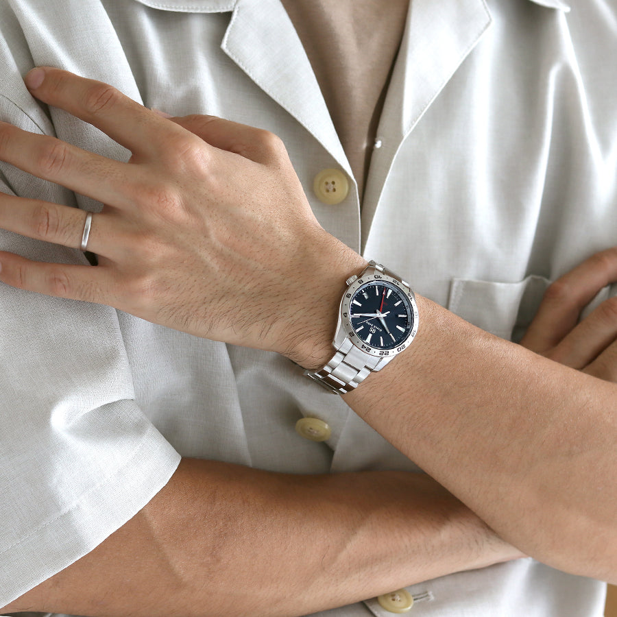 一回りコンパクトなケース径39のサイズ感が特徴。 ヘアラインを主としたケース、GMT表記の金属ベゼル、そして三列バンドが硬質感を演出。 20気圧の日常生活用強化防水、4時位置のねじロック式りゅうず、クロスラインを強調したルミブライトのように、グランドセイコースポーツコレクションに相応しいスペックを備えております。 シンプルなデザインでありながら重量感があり、スーツスタイルから、休日の大人カジュアルまで幅広く合わせることができます。 プレゼントにもおすすめです。 商品番号:SBGN029 ななぷれ価格 385,000円(税込) |