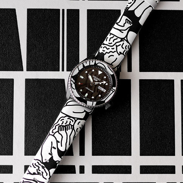 描きおろしのグラフィックを時計型で切り抜いたように見えるデザインが魅力。