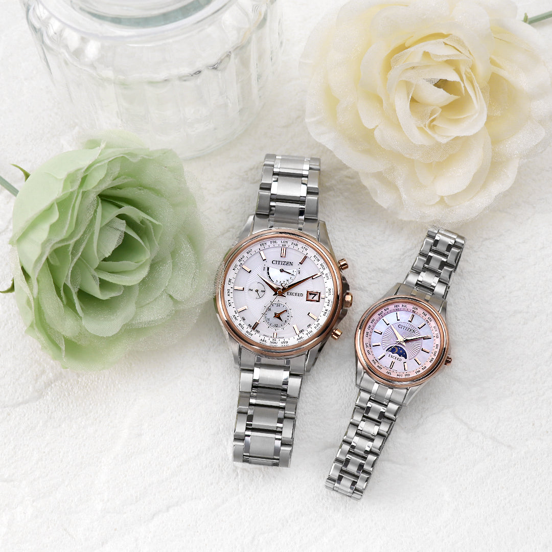 電波時計誕生30周年記念限定モデルのブランド横断企画 第1弾“YOAKE COLLECTION”に続く、第2弾“YOZORA COLLECTION”。 美しい月と星の輝く夜空に思いを馳せた限定ペアのコレクションです。 確かな品質と洗練されたデザイン。 大人のためのドレスウオッチ、シチズン EXCEED(エクシード)。 エクシードのハイエンドラインにペアモデルが登場。 メンズモデルには月齢自動計算機能“ルナプログラム”、レディスモデルにはサンアンドムーン機能を搭載しています。 デュラテクトサクラピンクの3連リングベゼルは、月の周りに白い光の輪が見える現象「月暈(つきがさ)」をイメージしました。 文字板には深みのあるブルーとラメを施して、美しい満天の星空を表現しています。ムーンフェイズ、サンアンドムーン部分には、夜空の月にかかる朧雲をイメージして、淡いブルーに彩色した白蝶貝をレイアウトしました。 3連リングベゼルなどにデュラテクトサクラピンクを使い、控えめな印象のライトシルバーのケースに知的で華やかなアクセントをプラス。 クラシックできらびやかなアラビア数字のインデックスが、ウォームゴールドの針とともにエクシードらしい優雅な雰囲気を演出します。 商品番号:EE1016-66L ななぷれ価格 184,800円(税込) ▼コチラからご購入いただけます▼