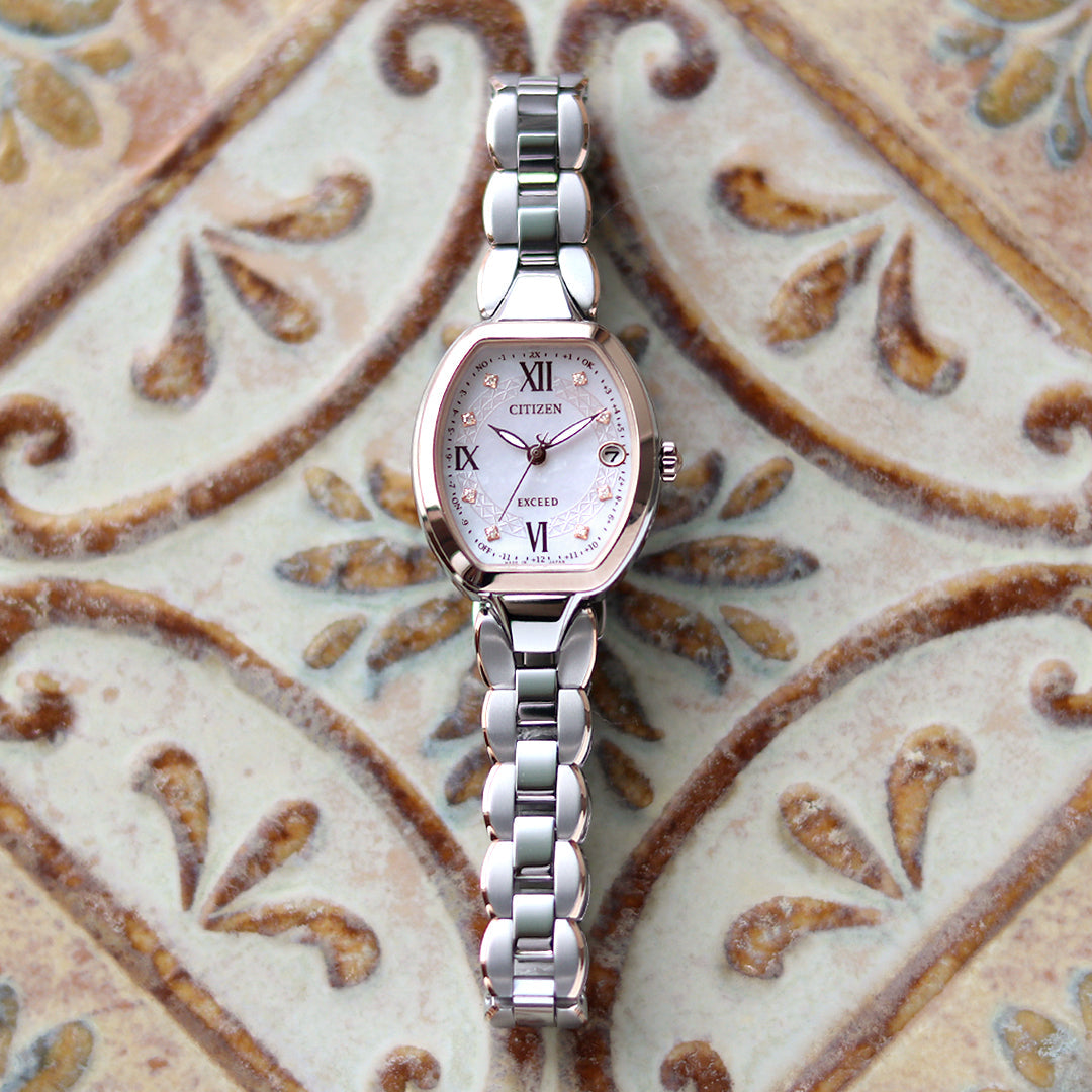 フェミニンで華やかなデザインが人気のダイヤモンド入りフラワーバンドモデルに、ハッピーフライト機能を搭載しました。ケースは透明感のあるツートン。肌なじみよく、主張しすぎないカラーがさりげない上品さを演出します。切子グラスや教会のモザイクタイルをイメージした白蝶貝彫刻の文字盤を採用しました。トノー型のケースもポイント。スーツスタイルから、休日の大人カジュアルまで幅広く合わせることができます。確かな品質と洗練されたデザイン。大人のためのドレスウオッチ、シチズン EXCEED(エクシード)。商品番号:ES9484-55W ななぷれ価格 115,500円(税込)発売日:22年5月  ▼コチラからご購入いただけます▼