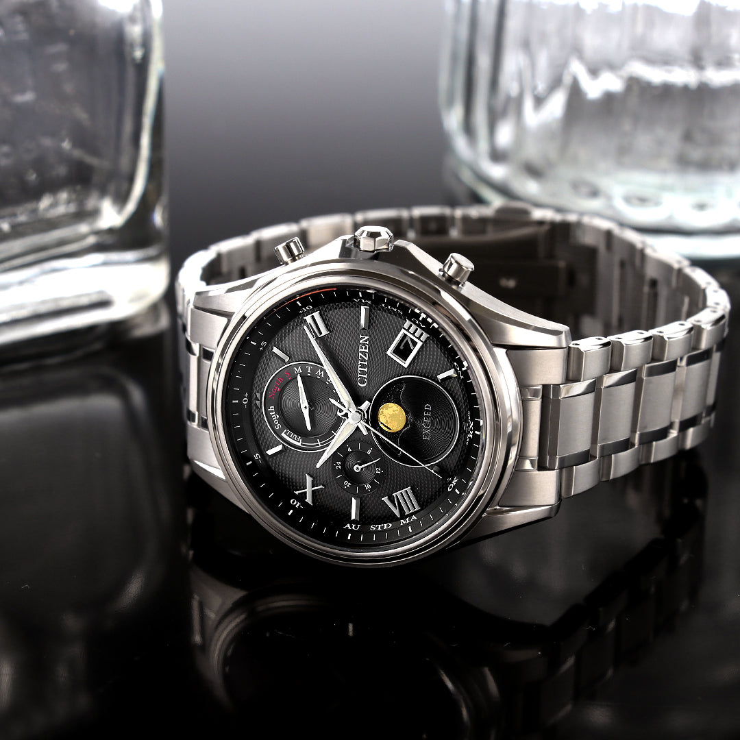 大人のためのドレスウオッチ、シチズン EXCEED(エクシード)。 メンズモデルは、月齢自動計算機能「ルナプログラム」搭載。 レディースモデルは、サンアンドムーン機能を搭載しています。 デザインのテーマは、月に薄い雲がかかったとき、その周囲に光の輪が現れる現象「月暈(つきがさ)」。 この現象は「幸せの訪れを意味するもの」として幸運のサインであるという言い伝えがあります。 月を金色で表現し、ローマ数字インデックスとともにエレガントな印象を与えています。文字板には、ギョーシェ加工の一種である麦の穂のような「グレンドルジュ」装飾パターンを施しています。 商品番号:(メンズ)BY1026-65A・(レディース)EE1016-66A ななぷれ価格 354,200円(税込) ▼コチラからご購入いただけます▼