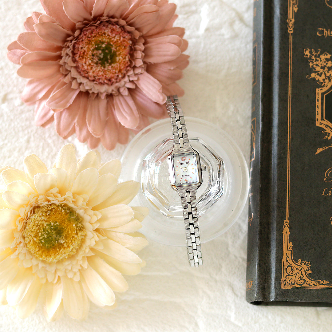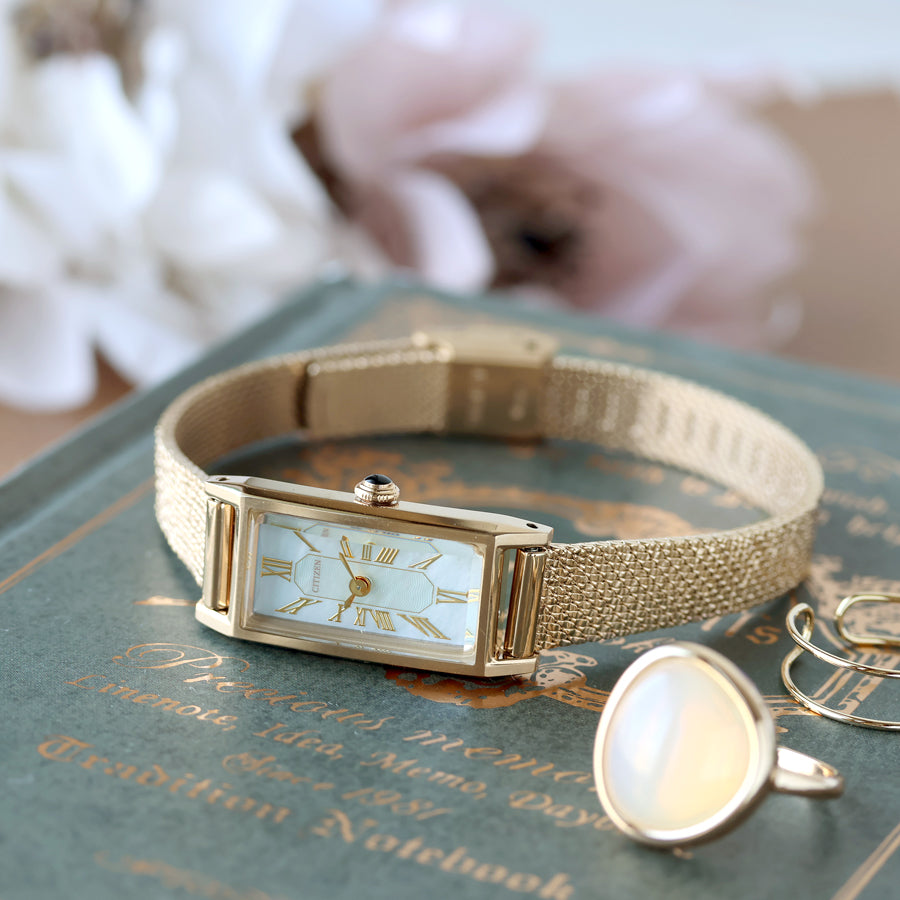 オーセンティックな表情と美しい白蝶貝が、華やかな手元を演出します。 華奢でありながら凜とした佇まい、スリムなケースが人気のスクエアモデルをベースに、美しい白蝶貝文字板を合わせた限定モデルです。 文字板中央に、ギョーシェ彫りを思わせるパターンを施し、高級感と華やかさをきわだたせています。 クラシカルな印象のメッシュバンドに、付け替え可能な革バンドをセットした2Way仕様。 ご自身で手軽にバンド交換ができるインターチェンジャブル構造です。 メイクやファションに合わせて印象が変えられます。 アンティークデザインのエコドライブアクセサリーウオッチ、シチズン Kii: (キー)。 商品番号:EG7040-74D 発売日:25年10月16日【予約商品】