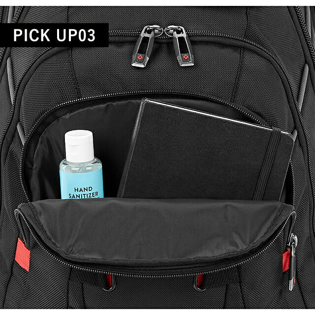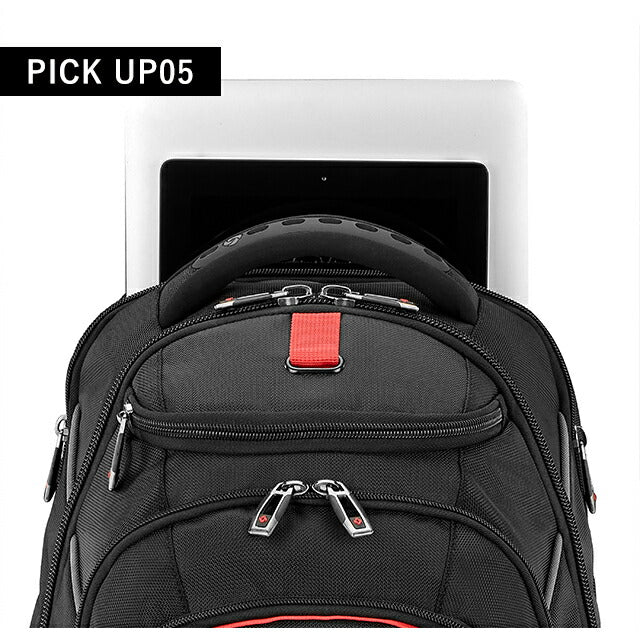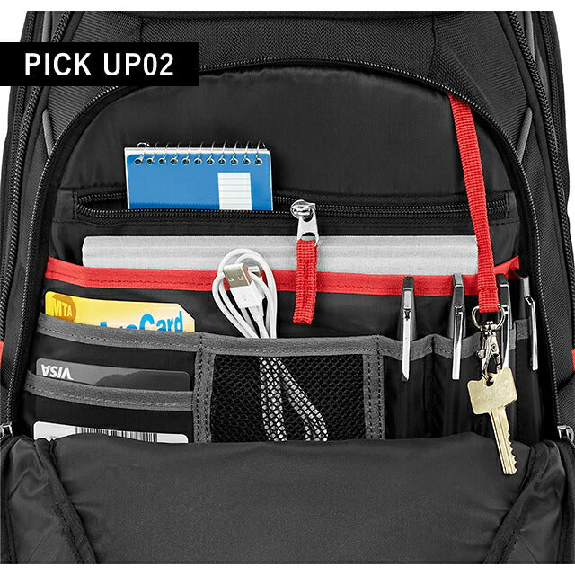 | 仕様 | 開閉:ダブルファスナー式 ・外側1 フロントジッパーポケット ・外側2 フロントジッパーポケット、オープンポケット×1、ジッパーポケット×1、メッシュポケット×1、カード入れ×3、ペンポケット×3、キーリーシュ ・外側3 フロントジッパーポケット ・外側4 ノートパソコン収納、タブレット収納 サイドポケット×2 トリコット裏地付きトップポケット スマートスリーブ |