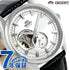 正規品 7年保証キャンペーン 送料無料 オリエント コンテンポラリー セミスケルトン オープンハート 自動巻き メンズ 腕時計 RN-AR0003S ORIENT CONTEMPORARY SEMI SKELETON アナログ シルバー×ブラック 革ベルト ◆オリエントより、46系F6ムーブメントに小秒を搭載したセミスケルトンのモデルがコンテンポラリーコレクションに登場。エッジの効いたケースに、9時位置のセミスケルトンと6時のスモールセコンドが特徴の立体的なダイヤルが魅力。カジュアルからスーツスタイルまでシーンを選ばず腕元を飾ります。また、裏蓋もスケルトン仕様になっており、ムーブメントを眺められ、お楽しみいただけます。 発売日:18年4月発売 機械式腕時計