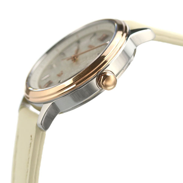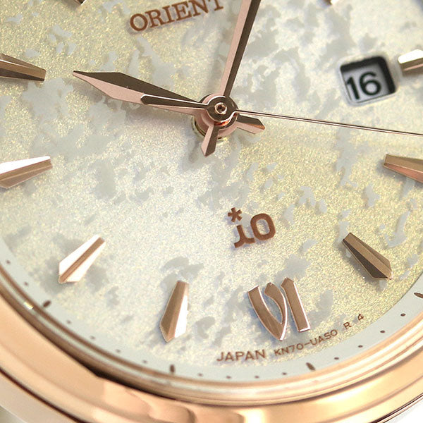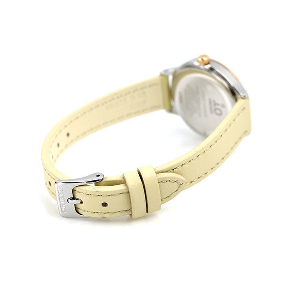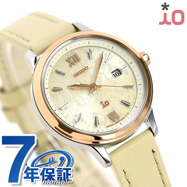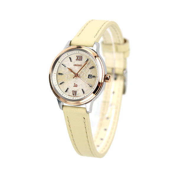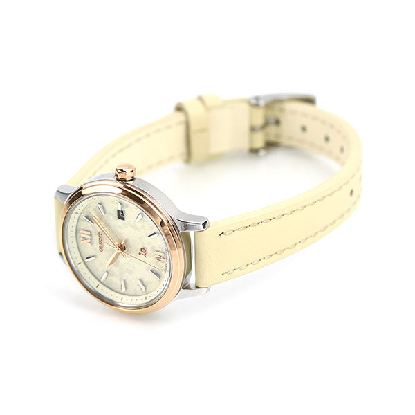 正規品 7年保証キャンペーン 送料無料 オリエント イオ チュラル&プレーン キャラメルマキアート 日本製 クオーツ レディース 腕時計 RN-WG0421S ORIENT iO NATURAL&PLAIN アナログ アイボリー 革ベルト ◆キャラメルマキアートをテーマにデザインされた大人のカラーモデルが登場。ベルトやケースはコーデに合わせやすいカラーを採用し、文字盤には甘いトッピングシュガーをイメージした模様をあしらい煌めきをプラス。文字盤のインデックスにはクラシカルなローマインデックスとバーインデックスを組み合わせることで、かわいらしさを見やすさを両立するデザインに仕上げました。幅広いシーンやファッションに合わせやすい柔らかなカラーリングが特徴で、きちんとした日にもおしゃれをしたい日にも一緒に出かけられるアイテムです。太陽や蛍光灯などの光で発電するライトチャージ搭載。 発売日:21年9月発売