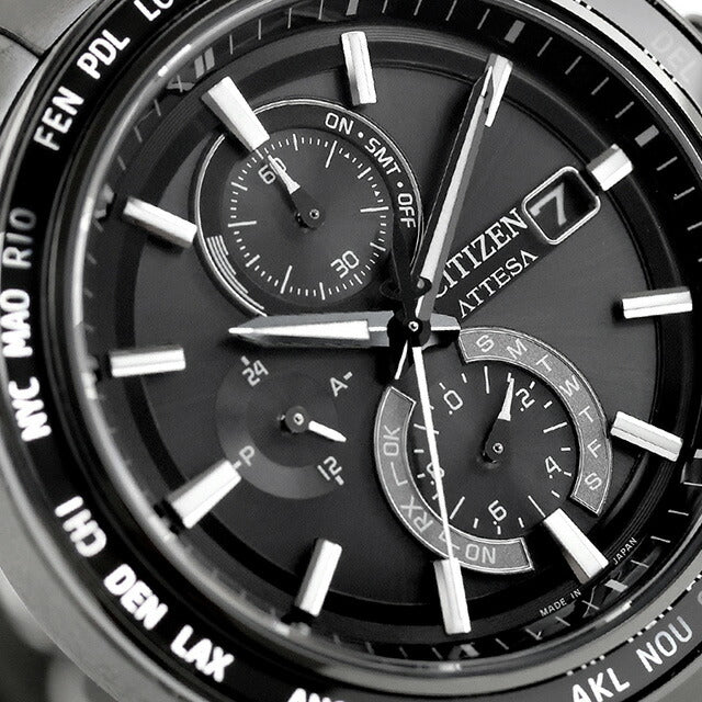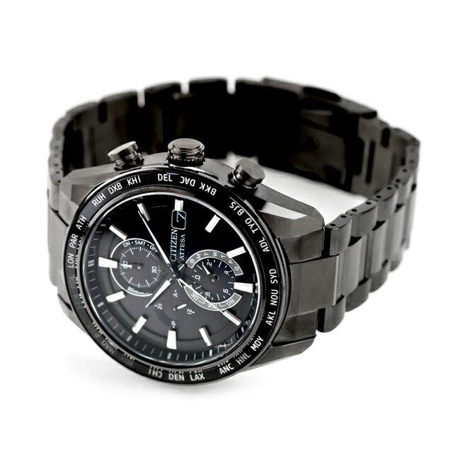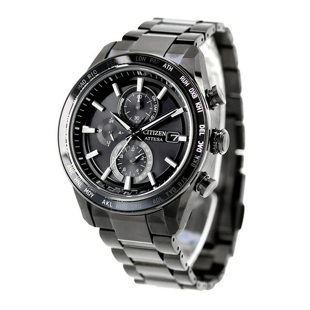 正規品 7年保証キャンペーン 送料無料 シチズン アテッサ ACT Line ダイレクトフライト チタン クロノグラフ 電波ソーラー 日本製 光発電エコドライブ電波 光発電エコ・ドライブ電波 メンズ 腕時計 AT8294-59E CITIZEN ATTESA アナログ ブラック 黒 ◆チタニウムで次世代を進み続ける、シチズン ATTESA(アテッサ)。人気の「ACT Line」AT818シリーズをベースにアップグレード。ベゼルにリング状のサファイアを埋め込み、美しい艶と輝きを宿したワンランク上の1本です。スーツスタイルとカジュアルの両方にフィットする、力強く軽快なデザイン。ベゼルはGPS搭載モデルで人気のサファイアガラスリングを搭載した高級仕様です。モノトーンでまとめたシックなデザインで視認性を確保しました。サファイアベゼルの上にシルバー蒸着で仕上げた都市名表示が輝きます。 発売日:2025年10月発売