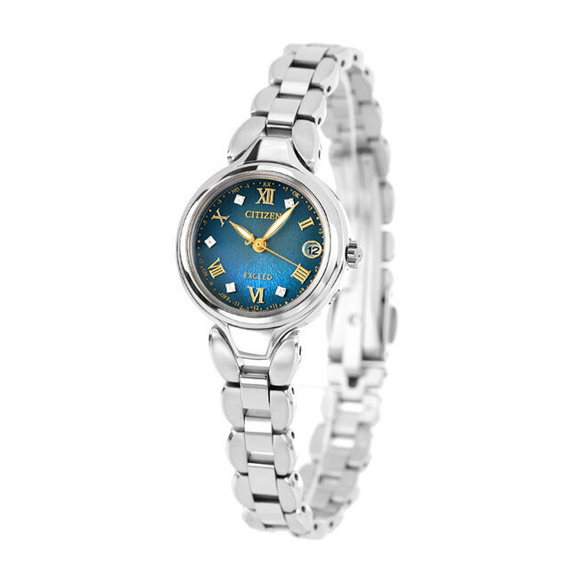 正規品 7年保証キャンペーン 送料無料 シチズン エクシード ダイレクトフライト 限定ペアモデル チタン 数量限定 ダイヤモンド 電波ソーラー 日本製 エコドライブ電波 エコ・ドライブ電波 レディース 腕時計 ES9470-68W CITIZEN EXCEED アナログ ブルーグラデーション ◆確かな品質と洗練されたデザイン。大人のためのドレスウオッチ、シチズン EXCEED(エクシード)。光の反射で色調の変化を生む構造色文字板とゴールドの針とインデックスを組み合わせて、蛍が舞う幻想的な黄昏時の情景を表現した限定モデルです。「蛍火の夜」をテーマにデザイン。富士フイルム株式会社の構造色インクに、グリーンのインクジェットグラデーションを重ね合わせた文字板で、蛍の光が様々な自然の光と交じりながら、夜の帳に染まっていく黄昏時の情景を表現しました。ゴールドの針とインデックスは、黄昏の景色に舞う蛍の光をイメージ。ローマ数字インデックスがエレガントな印象を与えます。5ポイントのダイヤモンドをセッティング。お花をモチーフにしたバンドがフェミニンで上品な印象を与えます。 発売日:2025年6月発売
