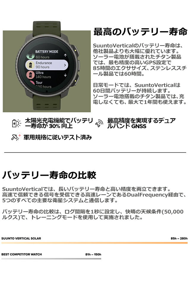 正規品 スント バーティカル Bluetooth メンズ レディース スマートウォッチ SS050978000 SUUNTO VERTICAL Solar All Black デジタル ブラック 黒 ◆Suunto(スント)は、フィンランドの冒険家トーマス・ヴォホロネン(Tuomas Vohlonen)によって80年以上前に創設されました。過酷な条件下での製品テストなど独自の水準を追及しています。 太陽光充電機能付きのアウトドア探検やトレーニング向けのアドベンチャーウォッチ。アクティブなライフスタイルのために役立つさまざまな機能が搭載されています。最大60日間のバッテリー持続時間。ランニング、サイクリング、ハイキングなど95種類以上のスポーツモードを搭載。血中酸素レベルや消費カロリー、睡眠を記録することができ、毎日の健康管理にも役立ちます。