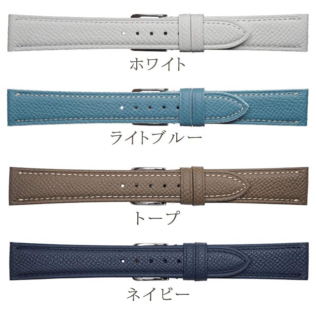 正規品 ミモザ エミッタ ワープロラックス 12mm 14mm 16mm 18mm 20mm 交換用ベルト 替えベルト カーフレザー 革ベルト 腕時計 WAPROLUX MIMOZA Emitta 選べるモデル ◆Emitta(エミッタ)は、アパレルを意識した素材感優先で「革」を厳選した、スタイリッシュさを追求するブランドです。デメリットとされていたエイジング(使い込むことによって色や質感が変化すること)こそ、良質の革の証であり、最大の魅力だと考えています。 ドイツのタンナー「ワインハイム社」の革を使用したベルトです。ほどよい柔らかさとほどよい目の大きさがエルメスレザーを彷彿とさせる、本格レザーです。Hウォッチやクリッパーなどのエルメスウォッチの替えベルトとして、おすすめです。エイジングはしにくいですが、傷や色落ちにも強いのが特徴です。使い込むと上質な光沢を帯びてきます。 ※サイズやカラー間違いにご注意くださいませ。 (カラー: ブラック ダークブラウン ブラウン オレンジ ホワイト ライトブルー トープ ネイビー )
