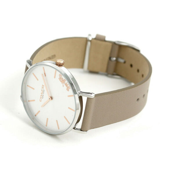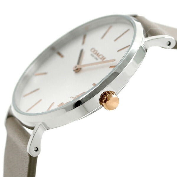3年保証キャンペーン コーチ ペリー 36mm 14503119 クオーツ レディース 腕時計 COACH PERRY アナログ シルバー×グレージュ 革ベルト ◆コーチは1941年にマンハッタンの小さなロフトで皮革製品の家内工業として始まりました。今日では世界中で絶大な人気を誇るファッションブランドです。男女問わず多岐にわたるシックで機能的なアクセサリーにきめ細かな最高品質の素材を用いて、現代的なアメリカンスタイルを取り入れた身近な高級品という新しい定義を形成しています。コーチブランドの柄、色、詳細な金具を取り入れたコーチウォッチは、最新のコーチバッグやデザインコレクションと新鮮でファッショナブルにマッチすると共に、精密なクオーツを備えてます。 ニューヨークシティのウェストヴィレッジの静かな通りの名前にちなんだペリー。伝統的なラウンド型のウォッチで、日常使いにぴったりです。4時位置のブランドロゴとシグネチャー柄の遊革がポイント。シーンを選ばないデザインは、自分へのご褒美にはもちろん、プレゼントにもオススメです。