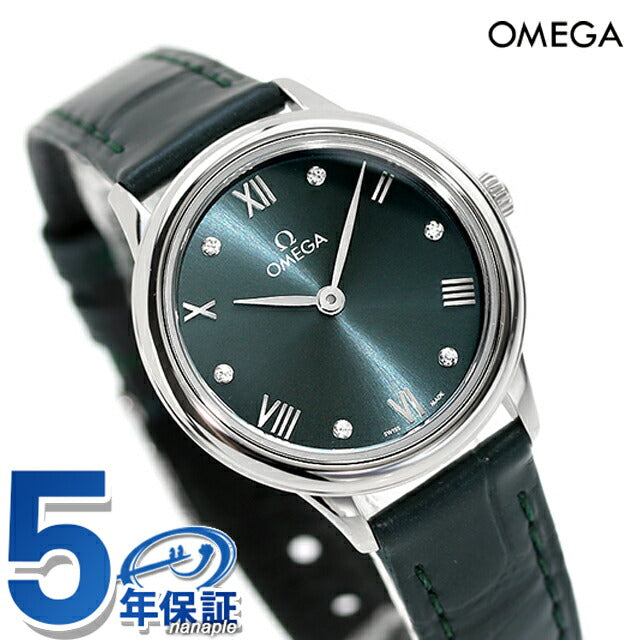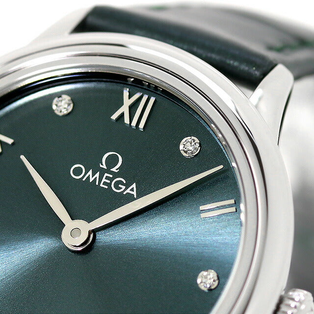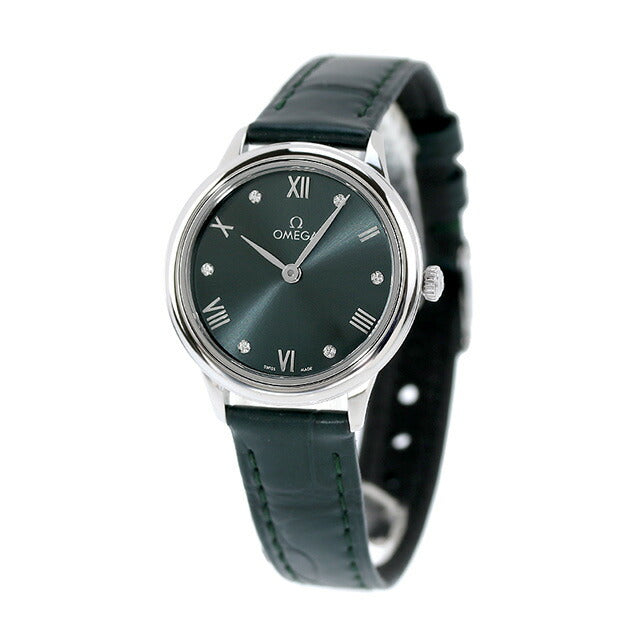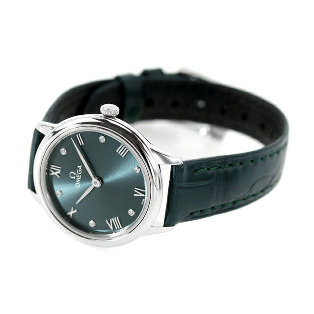 5年保証キャンペーン オメガ デビル プレステージ 27.5mm ダイヤモンド スイス製 レディース 腕時計 434.13.28.60.60.001 OMEGA De Ville Prestige アナログ グリーン ◆オメガは1848年、ルイ・ブランによってスイスにて設立された高級腕時計ブランドです。 1994年発売のタイムレスなコレクション、オメガ デ・ヴィル プレステージ。このモデルは、サンブラッシュ仕上げのPVDダークブルーグリーンのダイアルを備えています。また、ロジウム仕上げの針と、ローマ数字とダイヤモンドのインデックスが交互にセットされています。このタイムピースのシンプルな外観は、ケースバック全体にエンボス加工であしらわれた時の神クロノスのメダリオンによって引き立てられています。この時計には、きらめくダークブルーグリーンのレザーストラップが付属しており、オメガ クォーツキャリバー4061によって駆動しています。