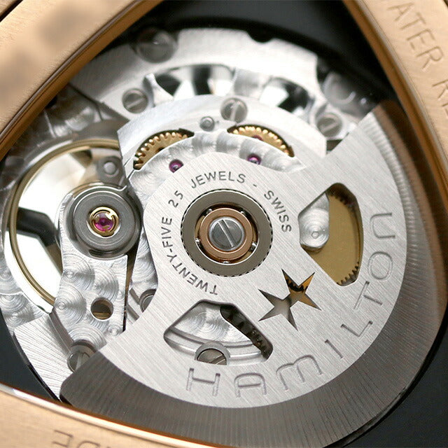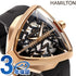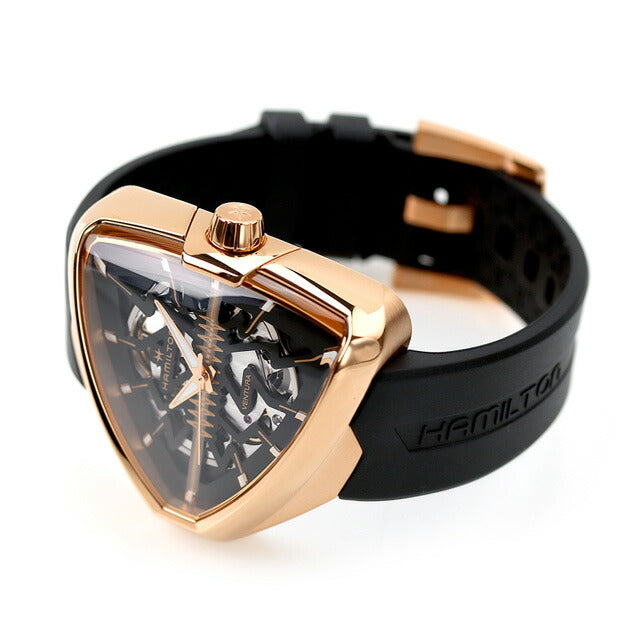 3年保証キャンペーン ハミルトン ベンチュラ Elvis80 スケルトン オープンハート スイス製 自動巻き メンズ 腕時計 H24525331 HAMILTON VENTURA ELVIS80 SKELETON AUTO アナログ ラバー ◆HAMILTON(ハミルトン)はアメリカ発祥の老舗ブランドです。創業翌年に誕生した懐中時計「ブロードウェイ・リミテッド」は、他の時計よりも正確に時を刻むことから鉄道用時計として採用されました。その後も航空用時計や軍用時計として採用されるなど、品質の高さと流行にながされない独自のデザインが世界中の人々に支持されています。 圧倒的な存在感を放つ「ベンチュラ Elvis80 スケルトン」は、世界初の電池式腕時計の過去、現在、未来を讃えるトリビュート。革新的なタイムピースが、力強くモダンなスタイルに昇華。中央の赤いジグザグのパルスが際立つスケルトンダイヤルは、ローズゴールドPVD加工が施された三角形のケースに収められています。 機械式腕時計