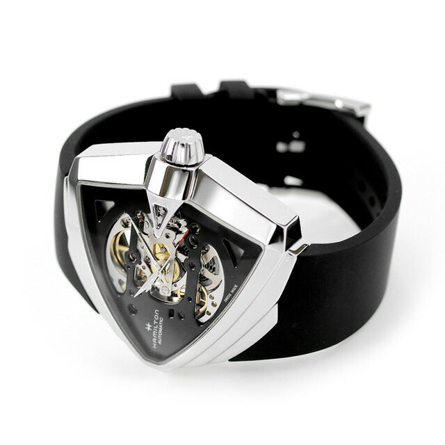 3年保証キャンペーン ハミルトン ベンチュラ XXL スケルトン オート 46mm オープンハート スイス製 自動巻き メンズ 腕時計 H24625330 HAMILTON VENTURA XXL SKELETON AUTO アナログ ブラック 黒 ラバー ◆HAMILTON(ハミルトン)はアメリカ発祥の老舗ブランドです。創業翌年に誕生した懐中時計「ブロードウェイ・リミテッド」は、他の時計よりも正確に時を刻むことから鉄道用時計として採用されました。その後も航空用時計や軍用時計として採用されるなど、品質の高さと流行にながされない独自のデザインが世界中の人々に支持されています。 大きな文字盤にユニークなカットアウトが精巧に施された「ベンチュラ XXL スケルトン オート」は、比類なきデザインのパワーを発揮します。2009年の発売以降も、個性的で存在感のあるデザインの人気は衰えず、支持され続けています。ムーブメントが透けて見える文字盤やシースルーバックケースなど、機械式時計ならではの動きを目で見て、腕に付けて楽しめる魅力的な商品です。 機械式腕時計