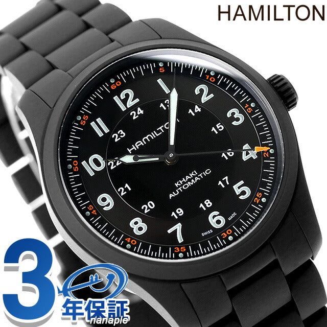 3年保証キャンペーン ハミルトン カーキ フィールド チタニウム オートマティック 38mm チタン スイス製 メンズ 腕時計 H70215130 HAMILTON KHAKI FIELD Titanium Auto アナログ オールブラック ◆HAMILTON(ハミルトン)はアメリカ発祥の老舗ブランドです。創業翌年に誕生した懐中時計「ブロードウェイ・リミテッド」は、他の時計よりも正確に時を刻むことから鉄道用時計として採用されました。その後も航空用時計や軍用時計として採用されるなど、品質の高さと流行にながされない独自のデザインが世界中の人々に支持されています。 ブラックPVD加工を施したチタニウム製ケースとブレスレットを備えるケース径38mmの「カーキ フィールド チタニウム」は、どんなシーンにもフィットする汎用性の高いタイムピースです。最適な視認性を実現するブラックダイヤルが、どんな状況でも正確に時を知らせます。また、ブレスレットにはサンドブラスト加工が施され、ミリタリーデザインに堅牢性と個性を与えます。軽量で、機能性とミリタリースタイルを組み合わせた「カーキ フィールド チタニウム」は、新たな体験を求める方の信頼できるパートナーです。 機械式腕時計